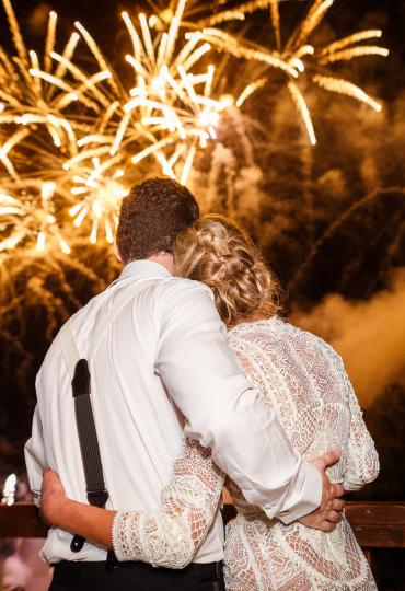 A bounty of food reflected "what Italian life is like," and the band kept guests on their feet all evening. Darian's parents presented the couple with a surprise fireworks display, followed by an after party around a large fire pit featuring a band, s'mores, and a pizza truck to keep revelers fueled.