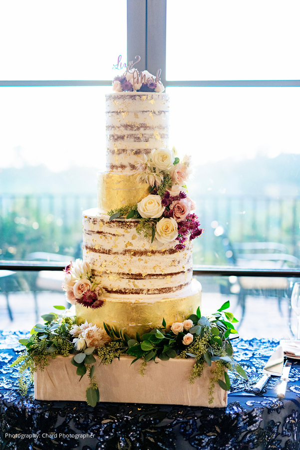 After two years of dating, the couple took a trip to Antigua, where Mark surprised his then-girlfriend with a sunset dinner on the beach with rose petals, torch lights, and champagne – for an early birthday dinner. A month later, the two were celebrating their anniversary at Mastro’s Steakhouse, where Elizabeth was greeted with roses and a poem in the menu. When she looked up, Mark was on one knee, which marked the beginning of a year-and-a-half-long wedding planning process.