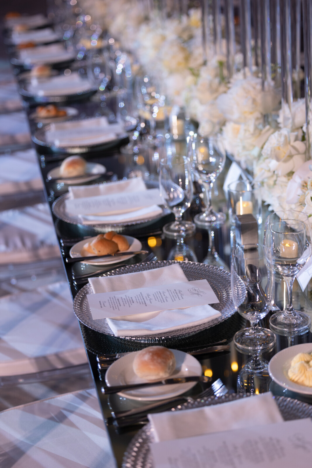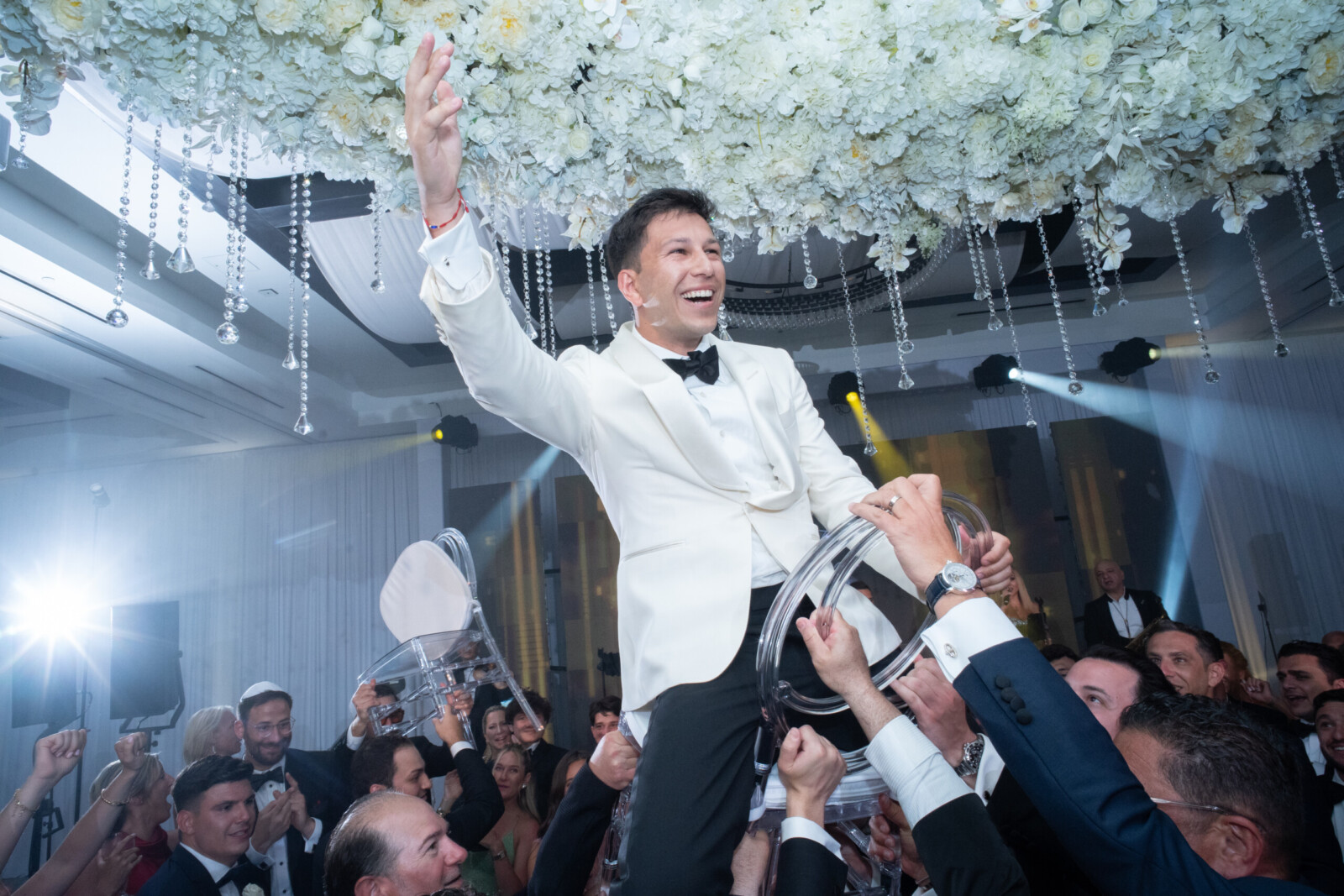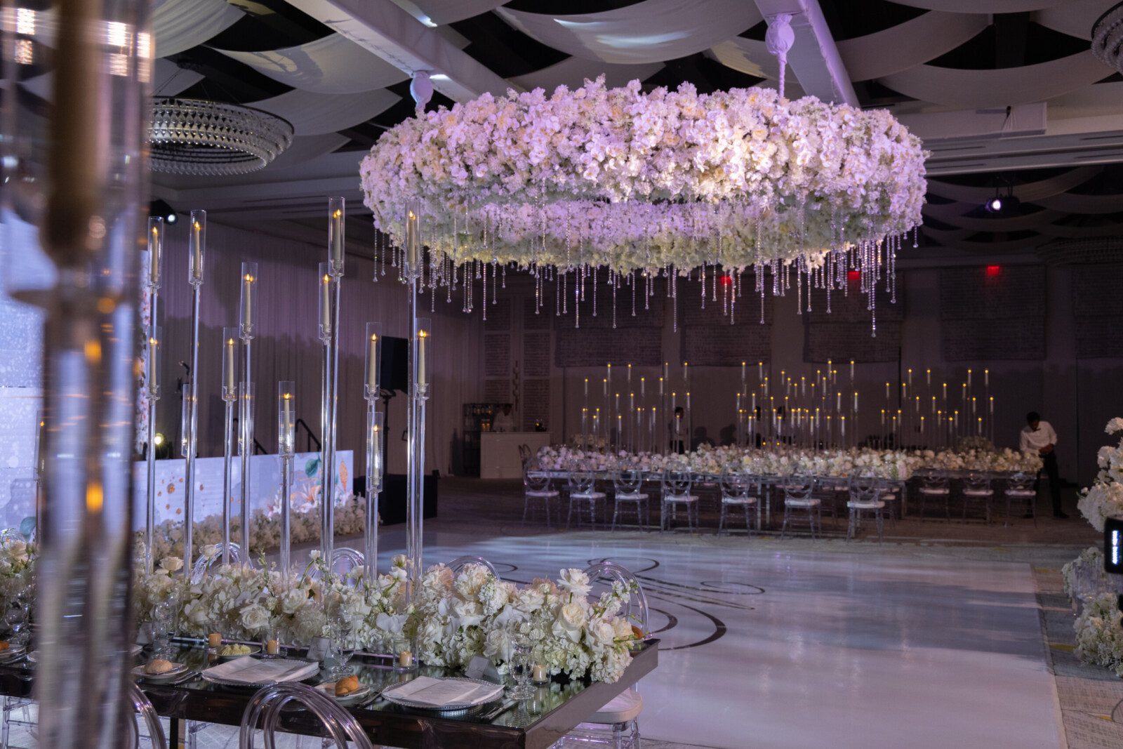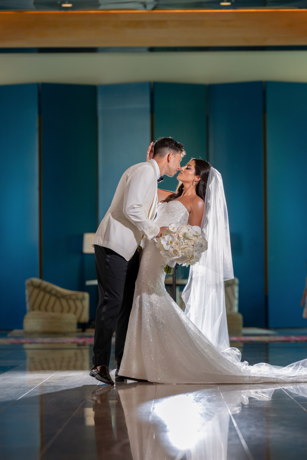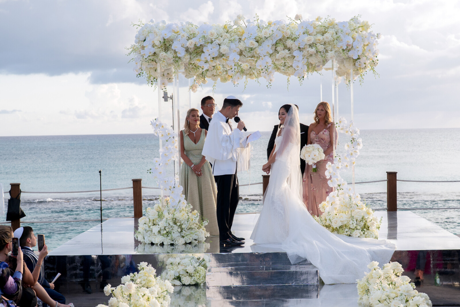 The couple’s destination wedding took place at Kimpton Seafire, where an oceanfront ceremony was followed by a glamorous indoor reception. The wedding décor included all-white floral arrangements designed by Celebrations, mirrored tables, and crystal details that added extra layers of luxury to their Cayman Island celebration.