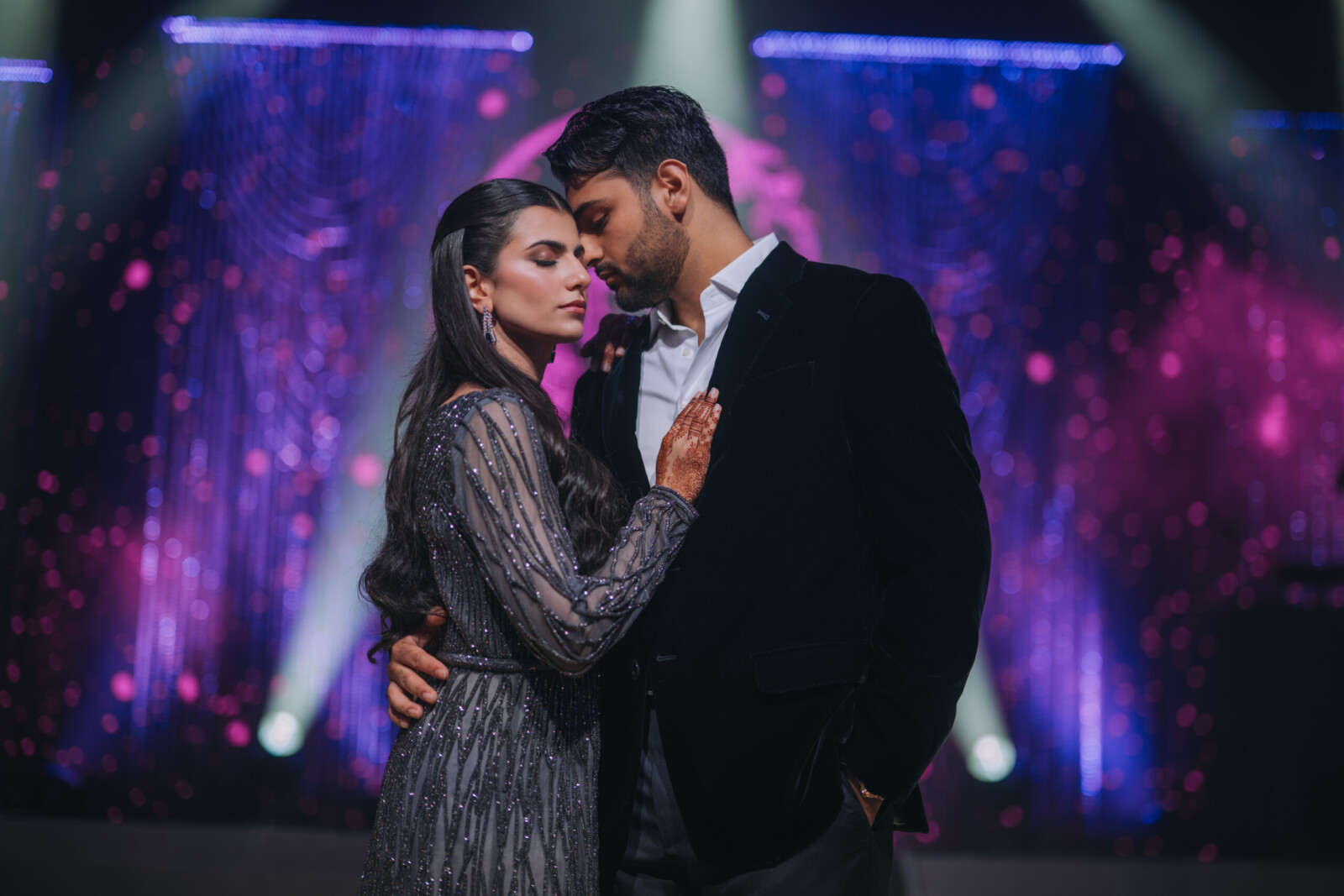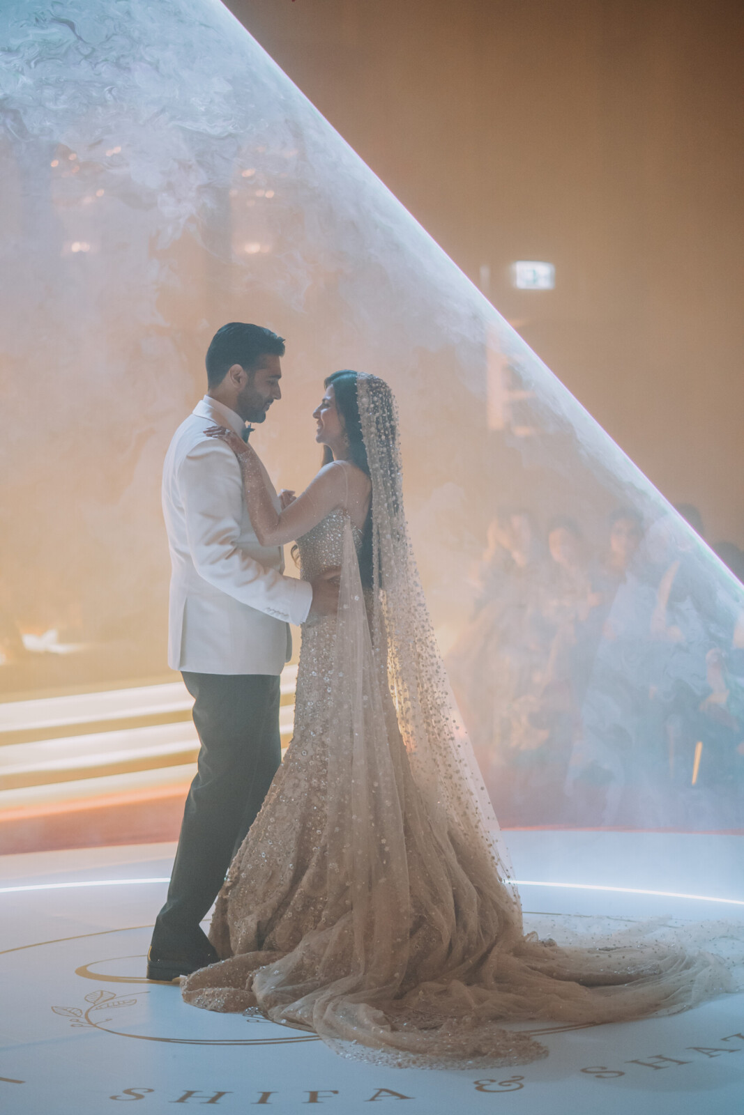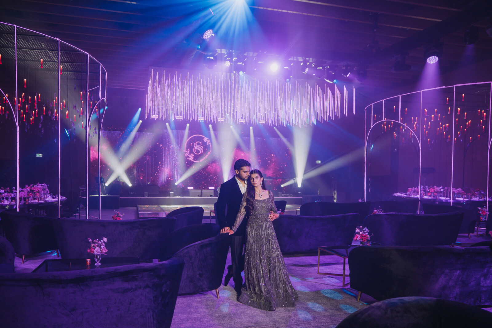 Later that evening, the couple hosted a dazzling Dubai Bling–themed Sangeet at Delano Dubai. The venue was transformed into a neon and crystal inspired spectacle, glowing with color. Dabka dancers welcomed the guests, building the hype before the couple made their spectacular entrance accompanied by traditional zaffa performers.