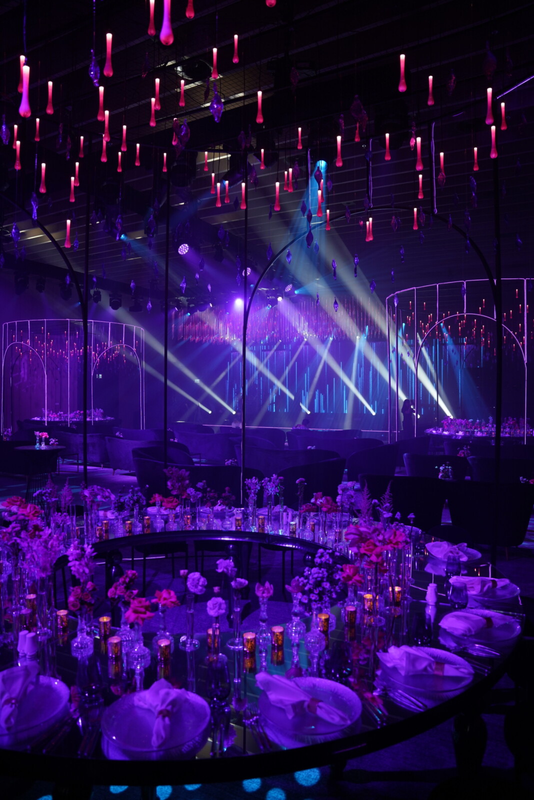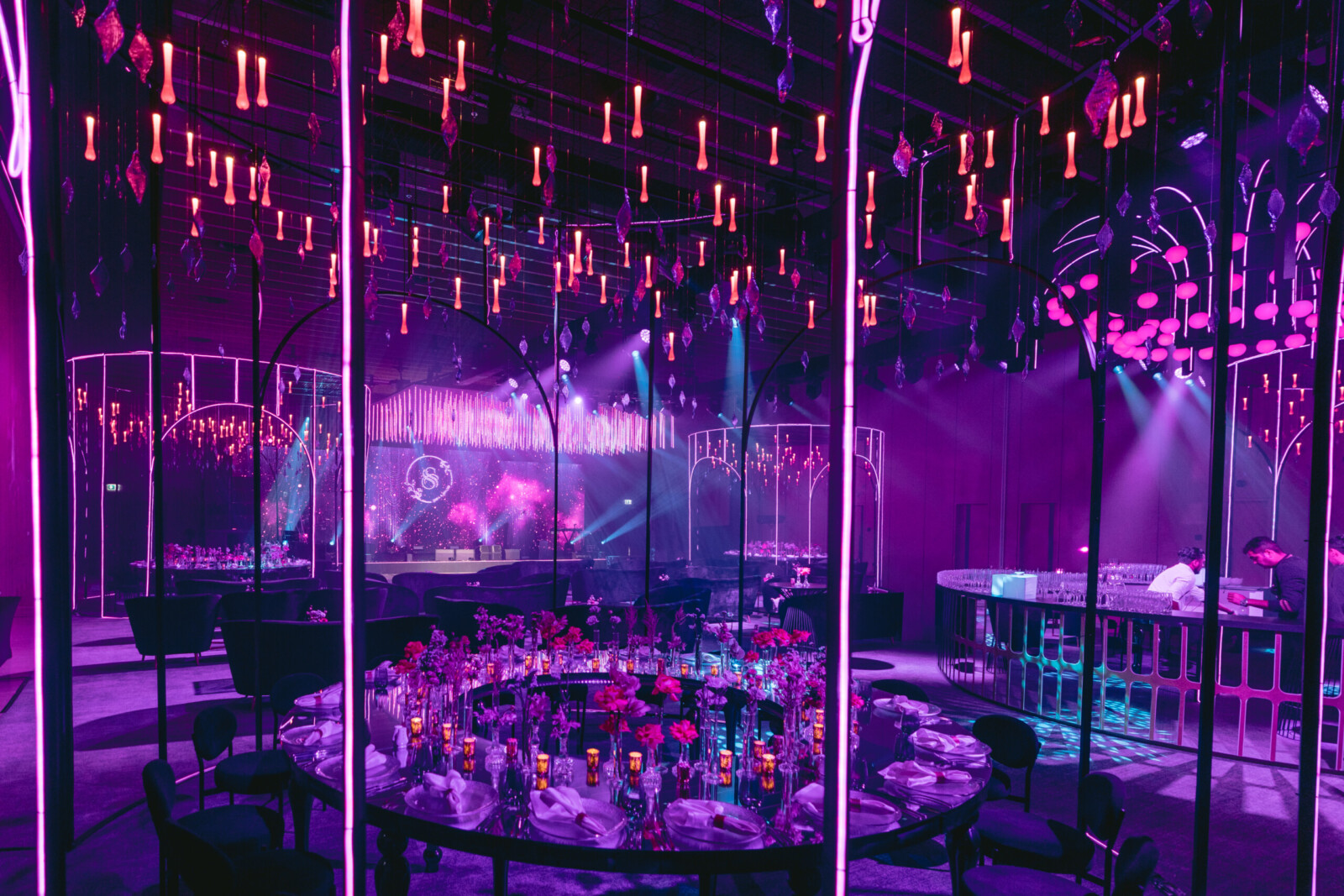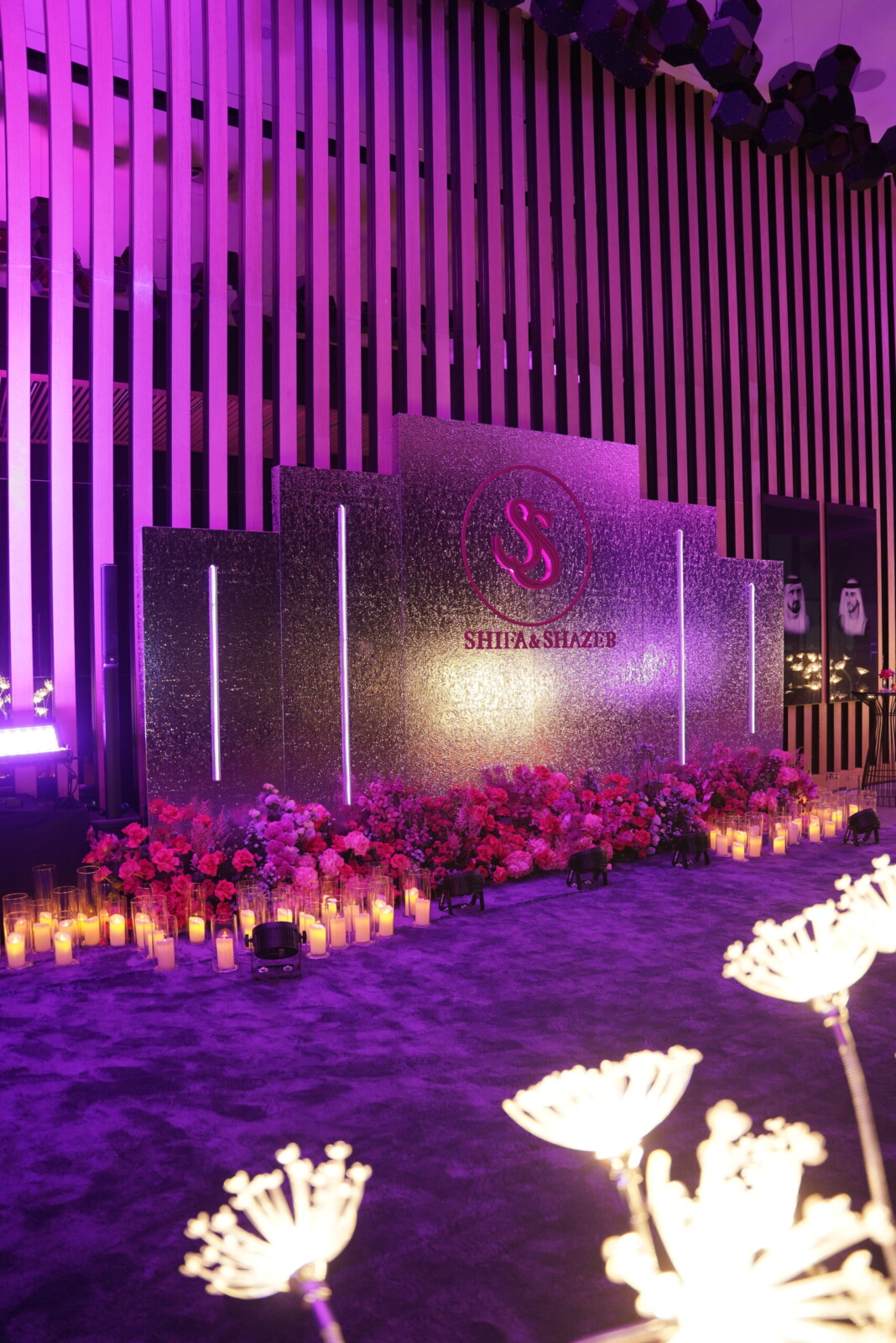 Later that evening, the couple hosted a dazzling Dubai Bling–themed Sangeet at Delano Dubai. The venue was transformed into a neon and crystal inspired spectacle, glowing with color. Dabka dancers welcomed the guests, building the hype before the couple made their spectacular entrance accompanied by traditional zaffa performers.