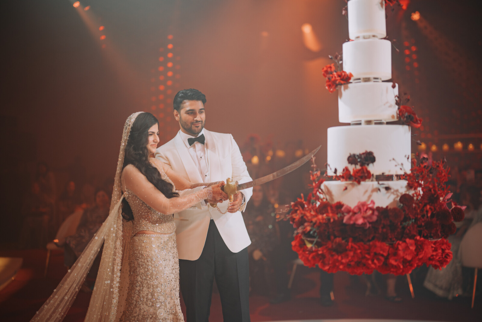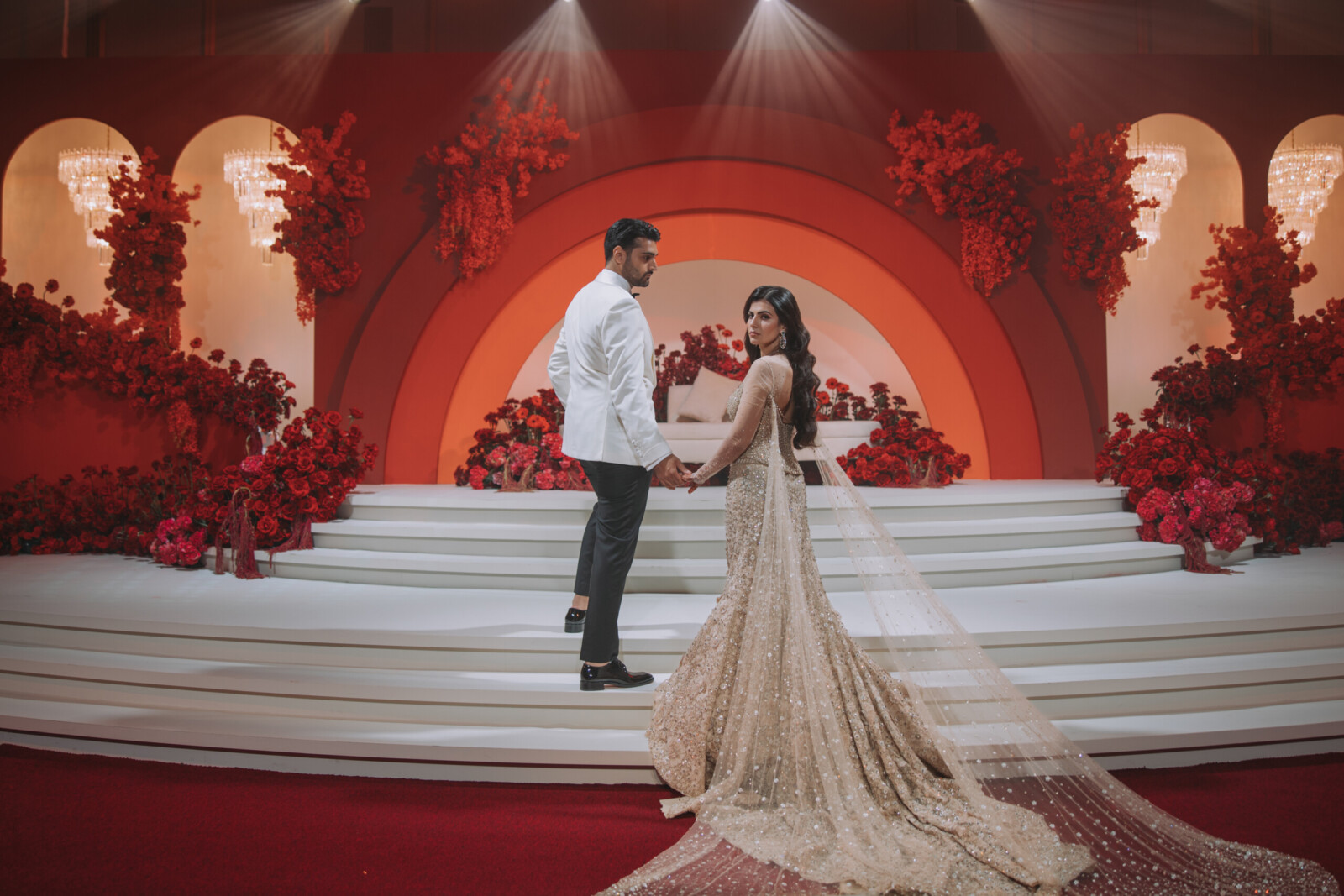 bride and groom in an all-red wedding reception in Dubai