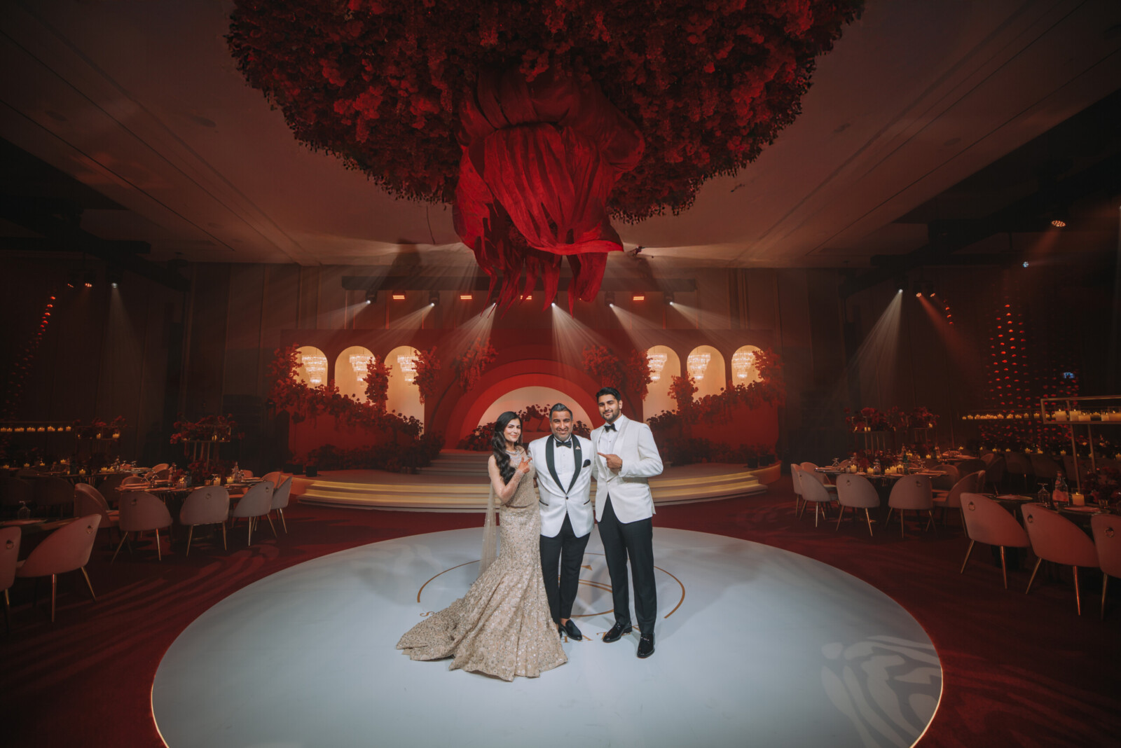 The grand finale of Shifa and Shahzeb’s multi-day wedding in Dubai was a luxurious, red-themed reception at the iconic Atlantis The Royal. It was an evening that left guests in awe. The ballroom was transformed into a stunning art installation—a handcrafted, fluid fabric structure draped the ceiling, complemented by cascading flowers and crystals. Above the dance floor, a striking floral sculpture gracefully concealing a surprise that was in store for the guests until the couple’s grand entrance.