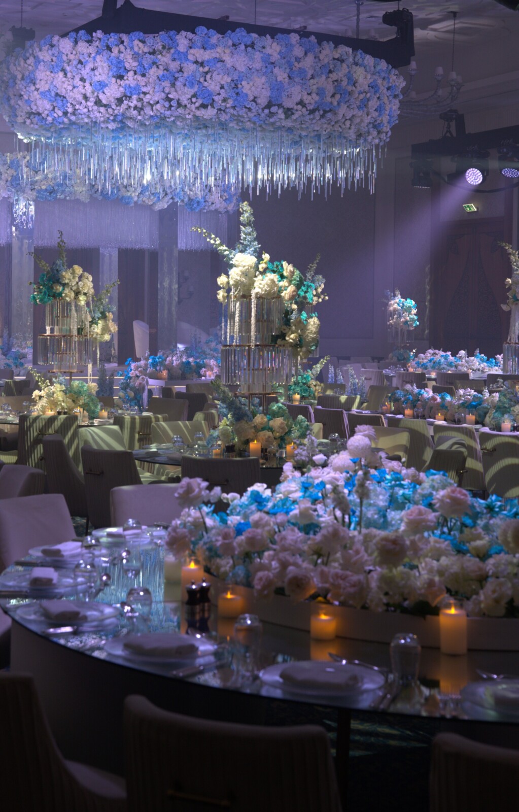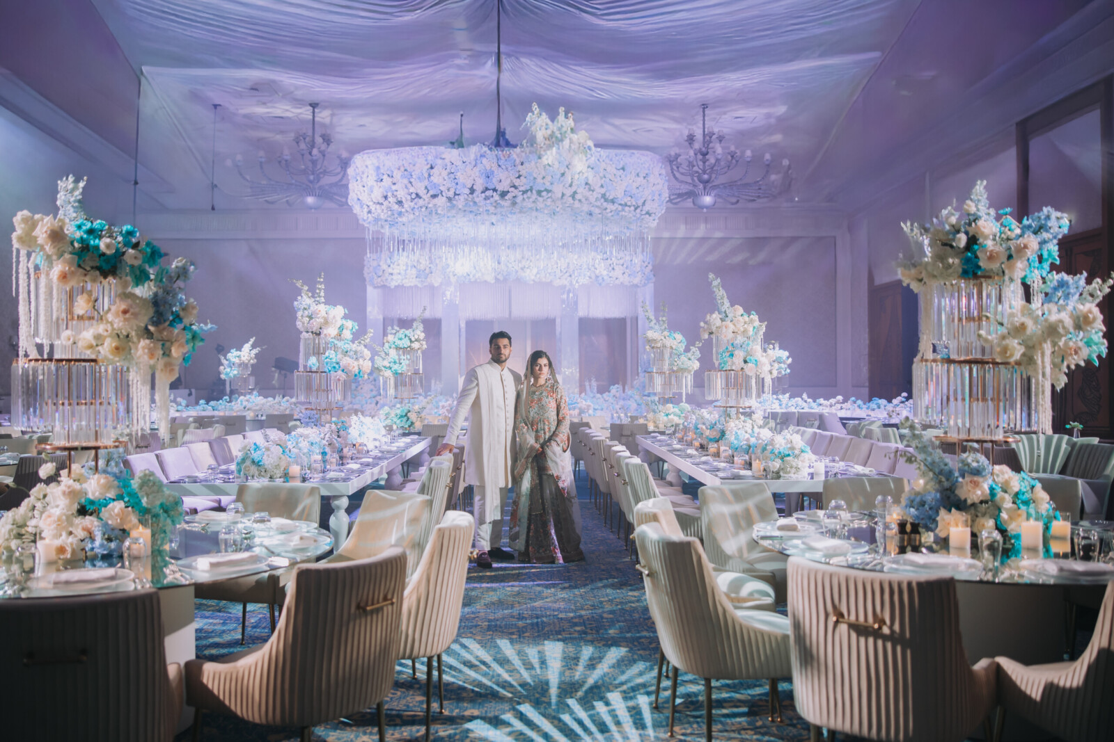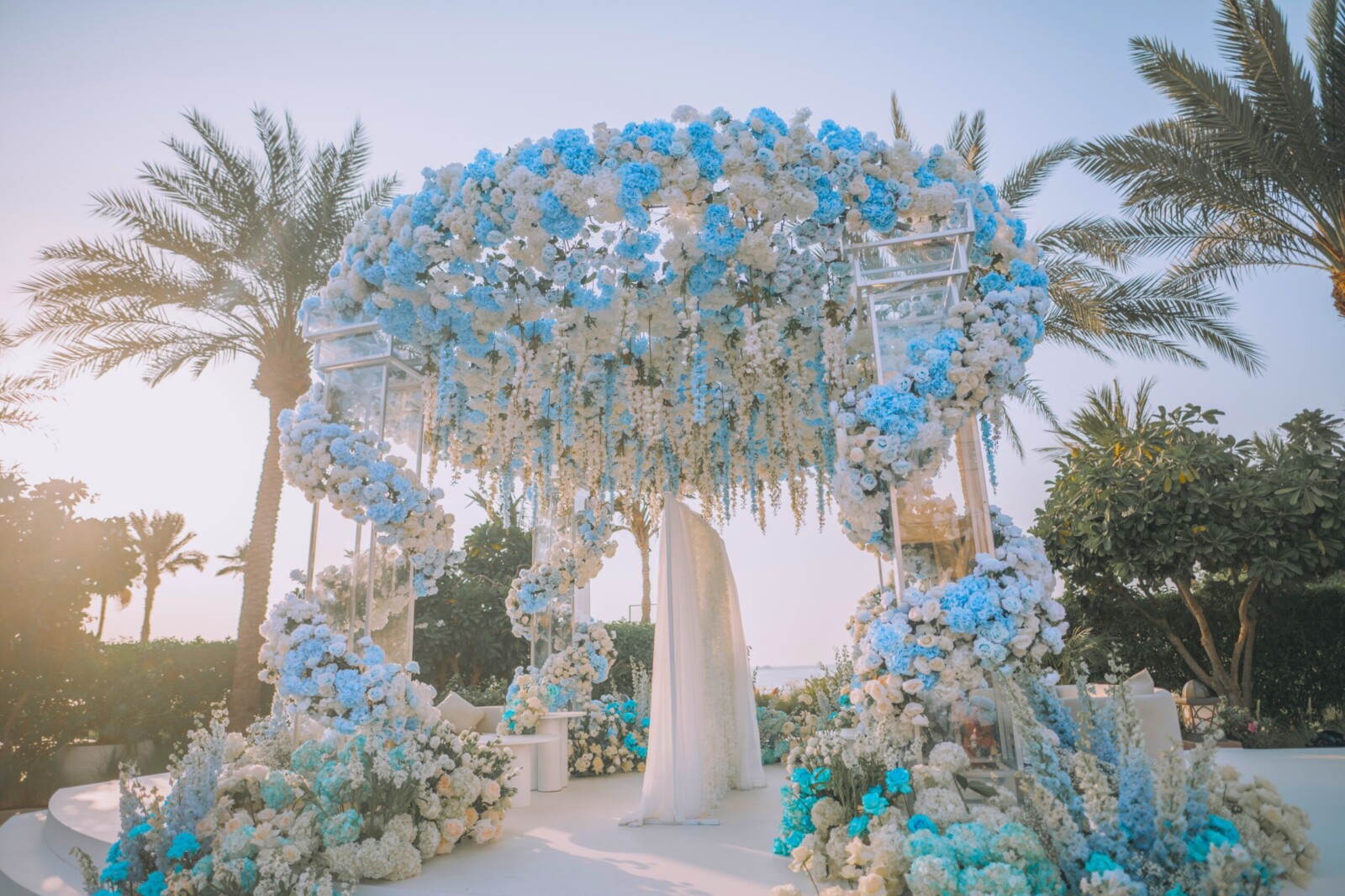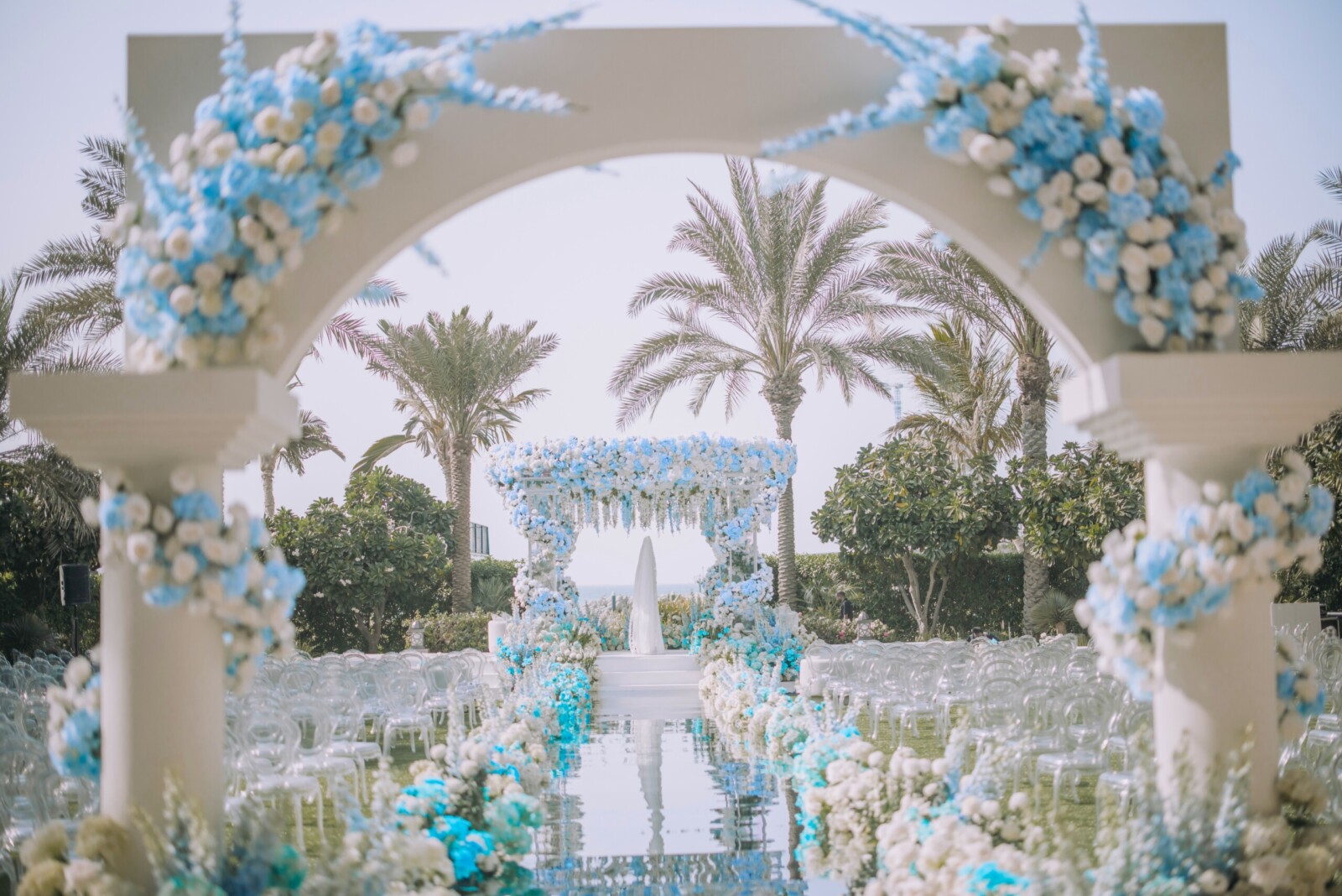 The following day, the serene Dana Garden and ballroom at Four Seasons Resort Dubai were transformed into a dreamlike floral wonderland. Soft hues of blue, white, and green set the scene for an ethereal Nikkah ceremony. Guests were left speechless as they entered the space, which resembled a fairytale garden brought to life.
