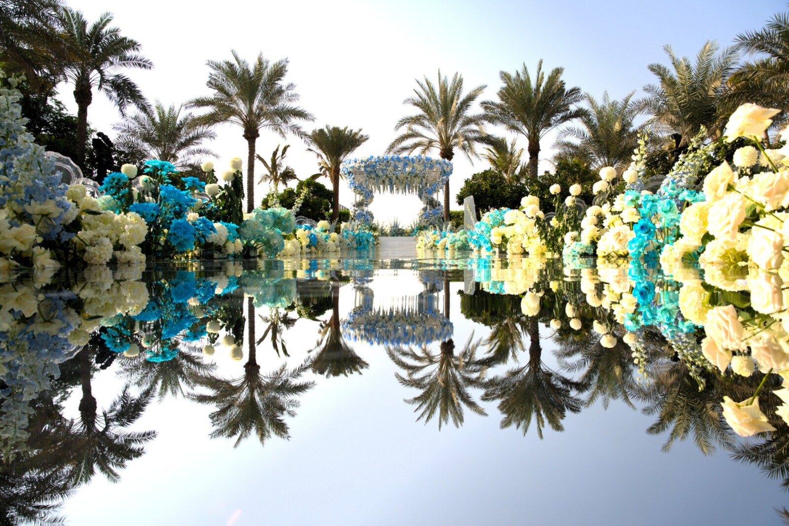 ethereal Nikkah wedding ceremony decor with mirrored aisle in Dubai