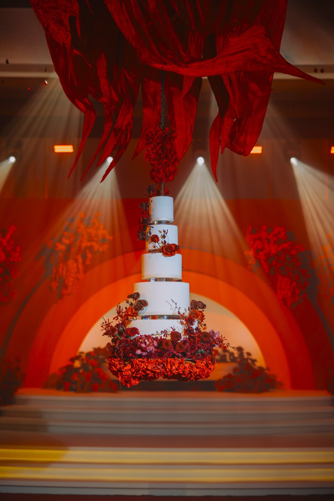 The evening was one of indulgence and elegance, with gourmet cuisine and signature mocktails to match. A major highlight was the dramatic reveal of a tiered white floral wedding cake descending from the floral sculpture on the ceiling, eliciting gasps across the room.