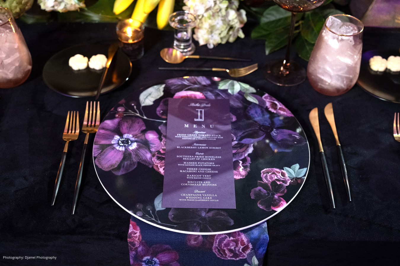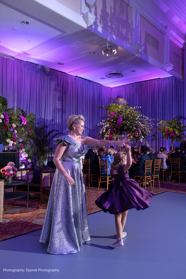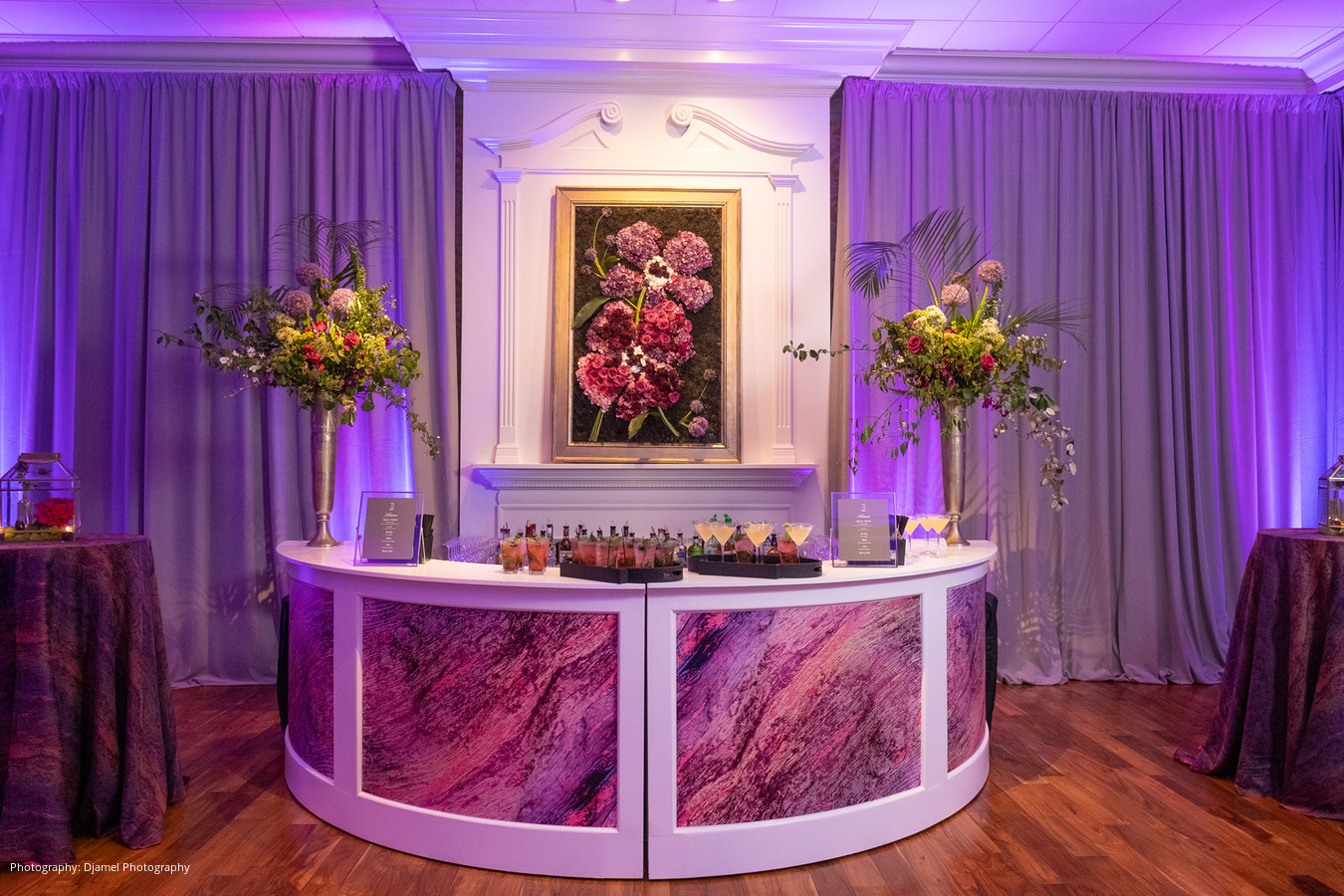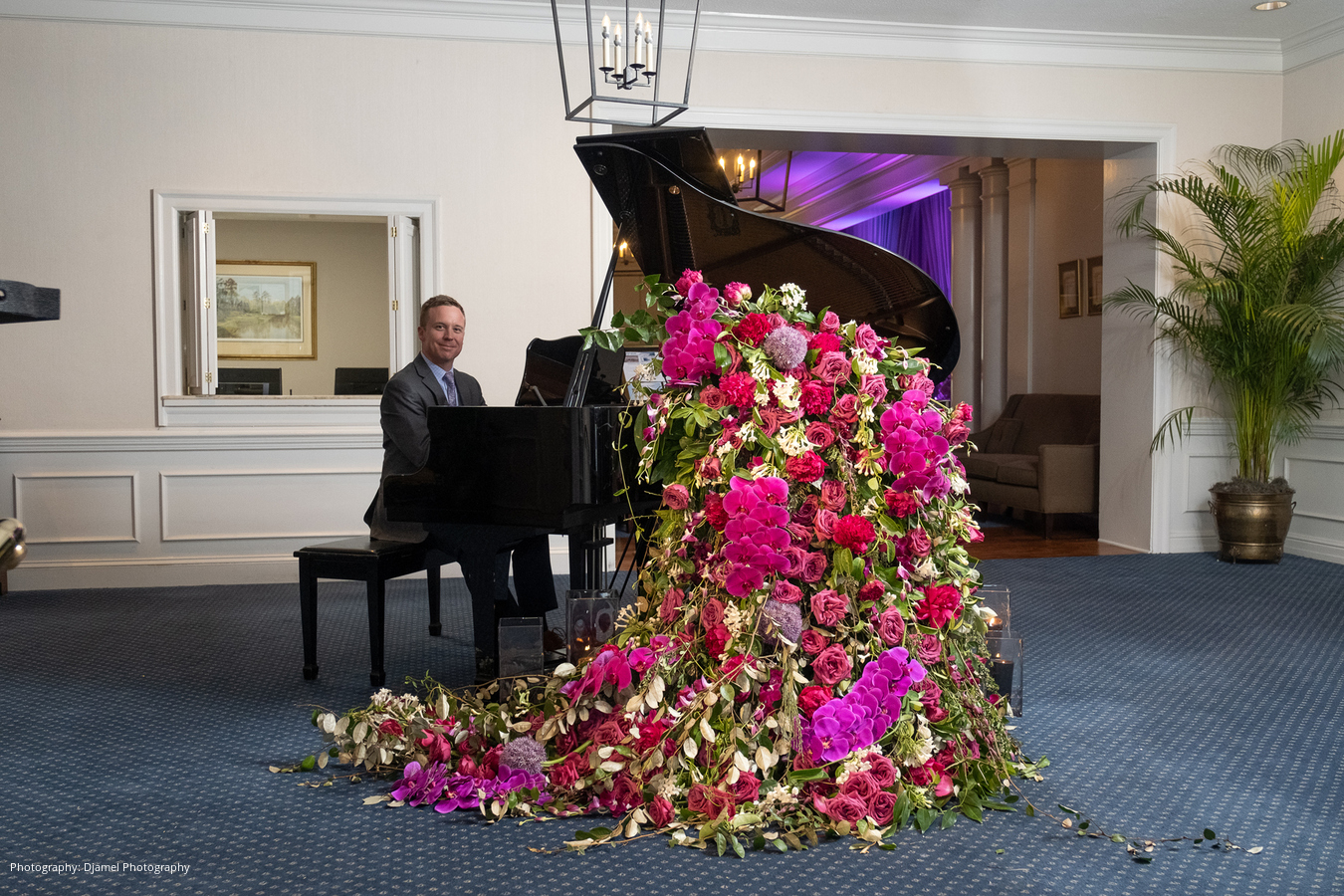 The reception that followed was nothing less than stunning. The theme for the evening was a sultry and sophisticated Palm Beach look with a masculine color palette of black, greys, plum, smokey amethyst and a touch of magenta. A waterfall of orchids cascading from the grand piano greeted guests as they entered the country club’s foyer. A fresh floral “painting”, inspired by the table linen, also hung behind the custom bar during cocktail hour. In place of a card table, guests were escorted to their table by the couple’s children, and the couple’s son-in-law was the Maître d.
