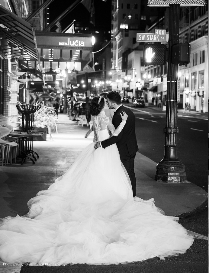 Within a week of the proposal, the newly-engaged duo got to work planning their wedding. After setting the date, they booked the reception in Hillsboro, a ceremony at their favorite chapel in Portland, and their favorite photographer, Dina Chmut. “Once we had the major things on board, we weren’t worried, because everything else would come along with time,” Ilona says. “I got a lot of my inspiration from Kate Middleton’s royal wedding with my dress and our wedding cake, so every step of planning was fun!”