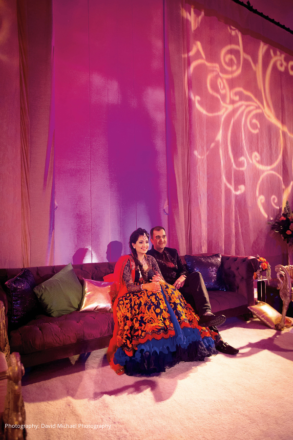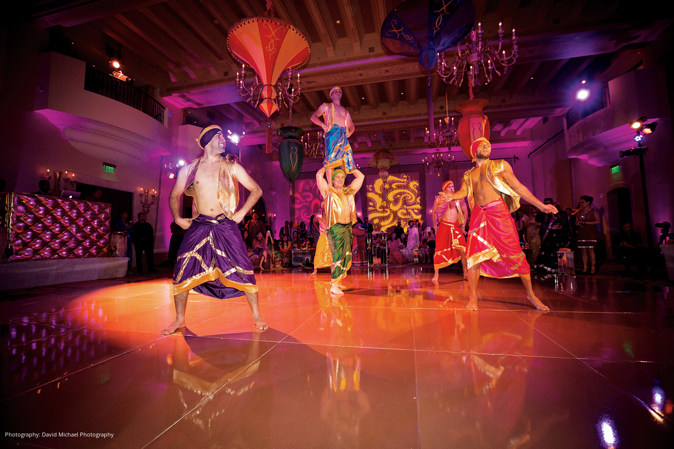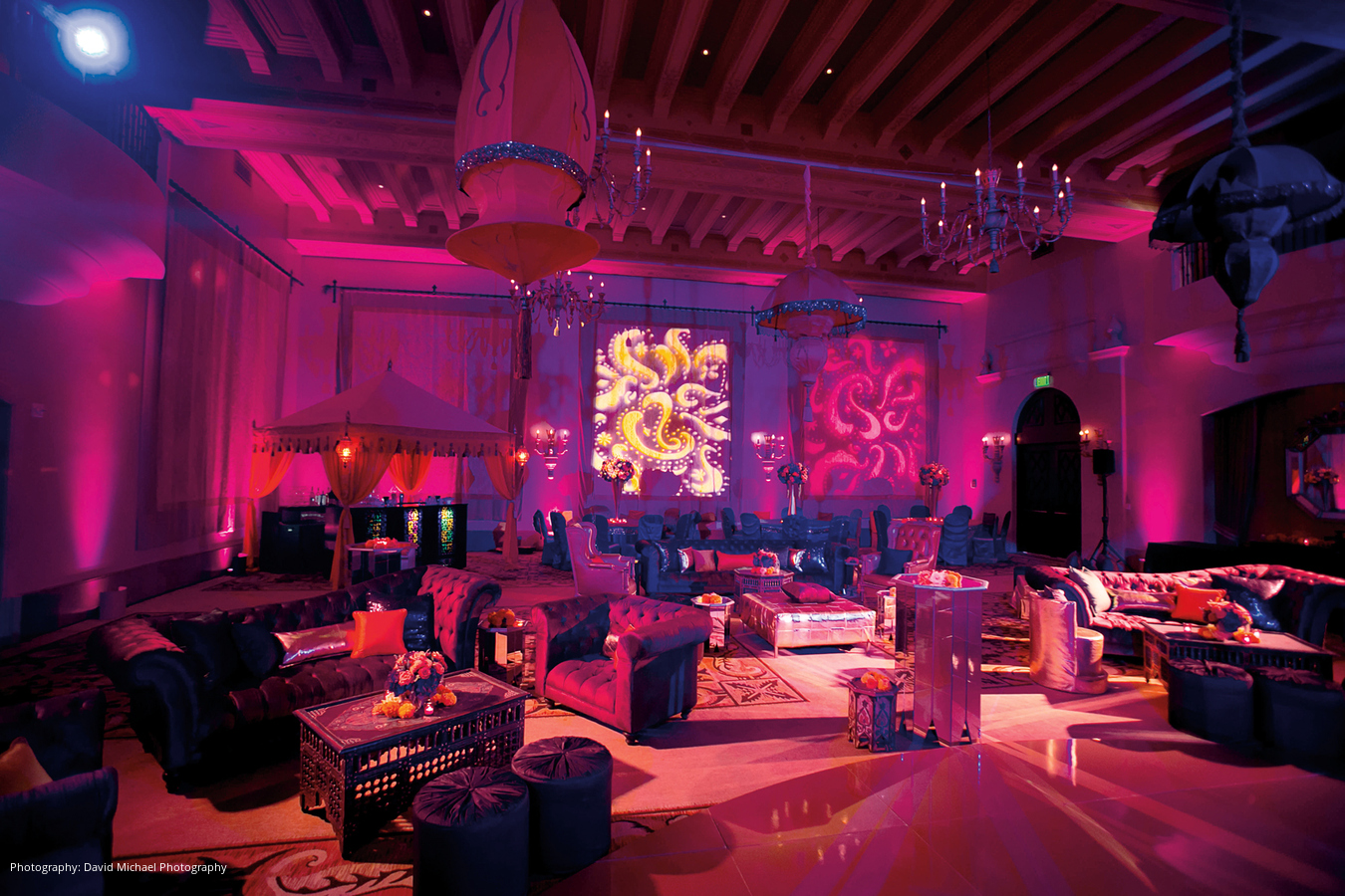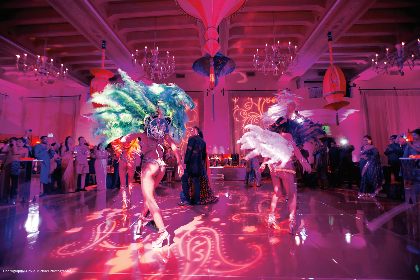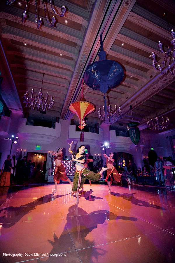Saturday evening was the Sangeet, a night of dancing to prepare the bride and groom for their ceremony the next day. The Montage Beverly Hills ballroom was transformed into an Arabian Nights vision of the streets of India with colorful canopies and ornate lanterns.