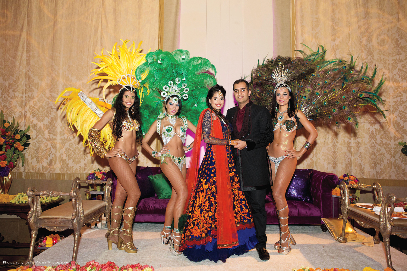 The group headed to the Beverly Hills Hotel for the Pheras, or taking of the vows, and the reception on Sunday. Arshad arrived in his Aston Martin and transferred to horse and carriage for the Baraat, or groom’s processional, stopping traffic on Sunset Boulevard. Wearing traditional Indian garb for the ceremony, the couple circled a burning flame and recited their seven vows. “After that we were officially married and had our first kiss,” says Jasmin.