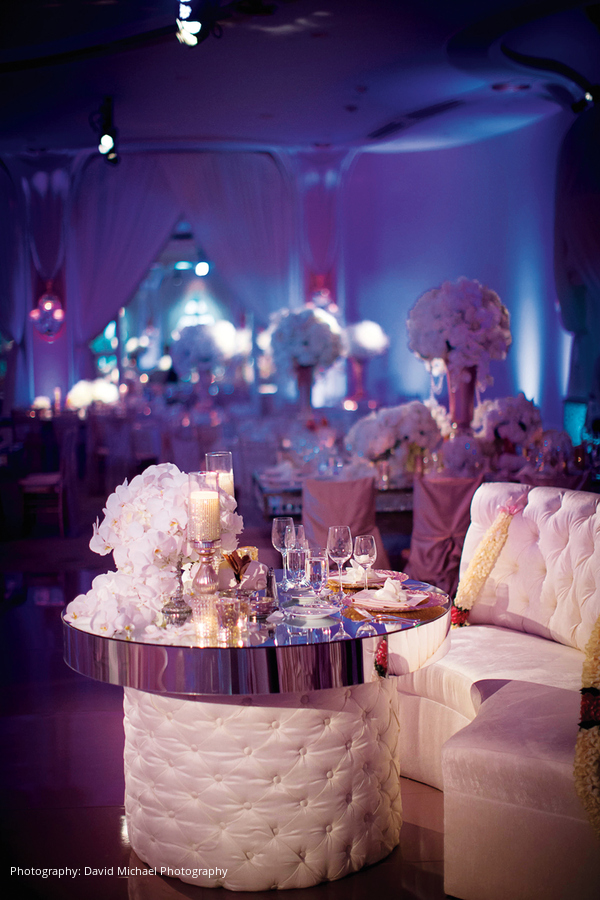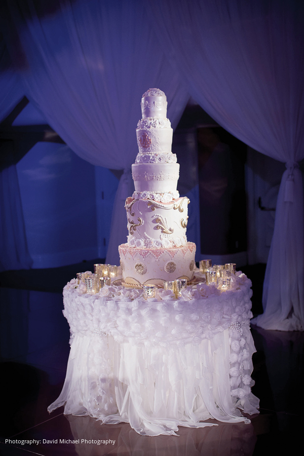 Location: Montage Beverly Hills, Beverly Hills, CA and The Beverly Hills Hotel, Beverly Hills, CA; Caterer: Bombay Palace, Beverly Hills, CA; Cake: Rosebud Cakes, Beverly Hills, CA; Event Design and Planner: Exquisite Events, Los Angeles, CA; Floral Design: The Hidden Garden, Los Angeles, CA; Linen: Wildflower Linen, Los Angeles, CA; Rentals: Revelry Event Designers Los Angeles, CA; Lighting: Ambiance AV, Santa Monica, CA; Entertainment: West Coast Music, Beverly Hills, CA; Stationery: The Entertainment Design Co., New Delhi, India; Wedding Dresses: Marchesa and Ankur Batra; Bride’s Shoes: Miu Miu, Manolo Blahnik and Prada; Groom’s Tuxedos: Hugo Boss and Ankur Batra; Groom’s Shoes: Salvatore Ferragamo and Louis Vuitton; Engagement Ring and Wedding Bands: Tiffany & Co.