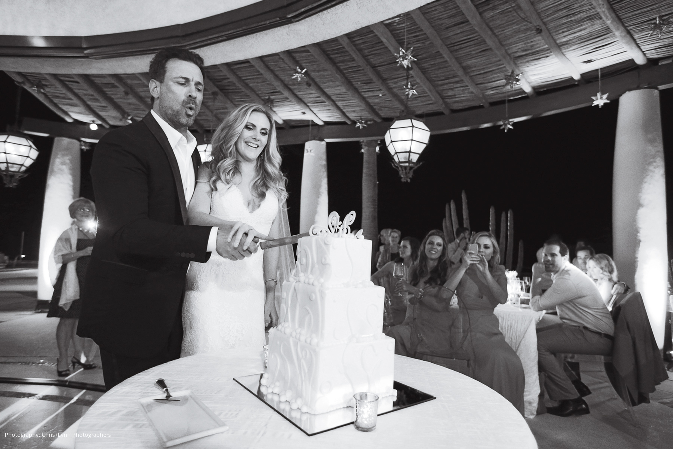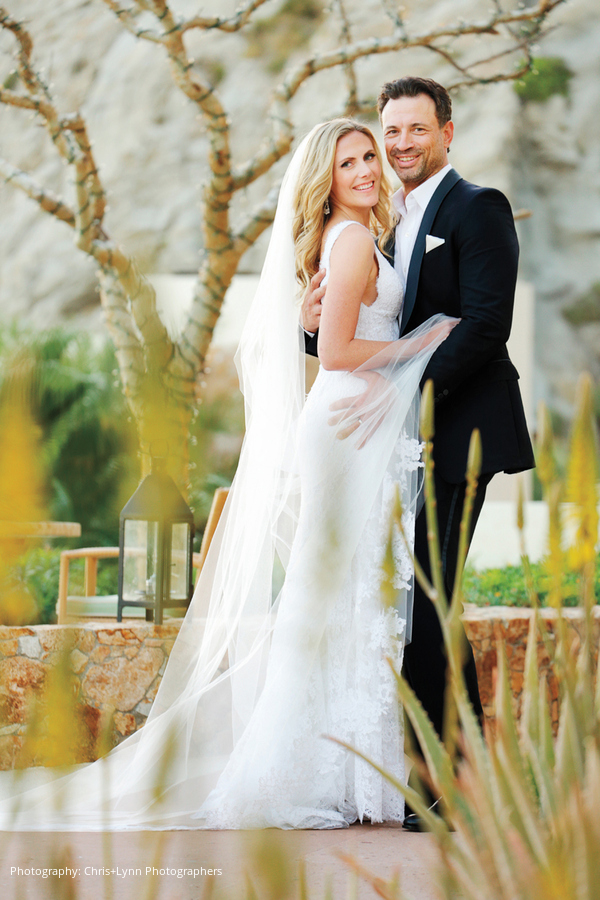 Location and Caterer: Capella Pedregal, Cabo San Lucas, Mexico; Cake: Sweet Dreams Cabo Special Occasion Cakes, Cabo San Lucas, Mexico; Event Design and Planner: Cristina Verger Event Planning & Production, New York, NY; Floral Design: Areté Florals, Cabo San Lucas, Mexico; Linen and Rentals: Del Cabo Event Design, Cabo San Lucas, Mexico; Rentals: Audio Visual Services and The Main Event Cabo, Cabo San Lucas, Mexico; Lighting: J&S Audio Visual, Cancun, Mexico; Wedding Dress, Veil and Shoes: Monique Lhuillier; Groom’s Tuxedo: Gucci; Engagement Ring and Bands: Kwiat; Photography: Chris+Lynn Photographers, British Columbia, Canada