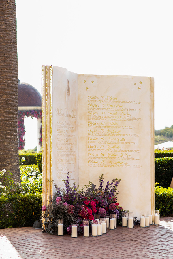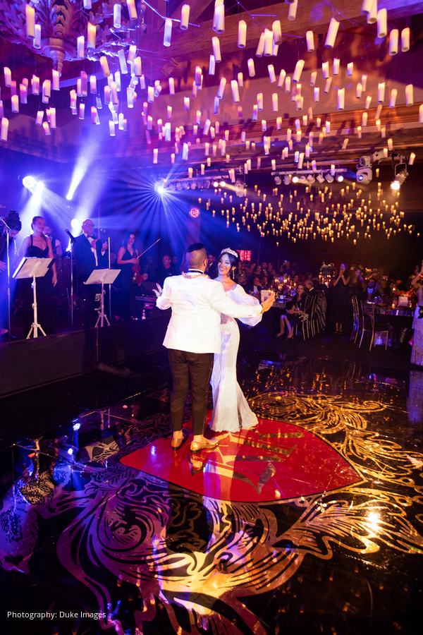 We had a heavy cocktail reception with many stations including sushi, sliders, tacos, street corn, and delicious craft cocktails. One of our favorite details was a beautiful Harry Potter inspired family crest with our initials that covered the entire shiny black dance floor.”
