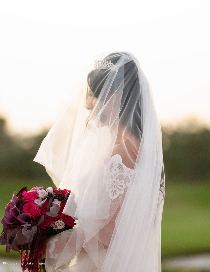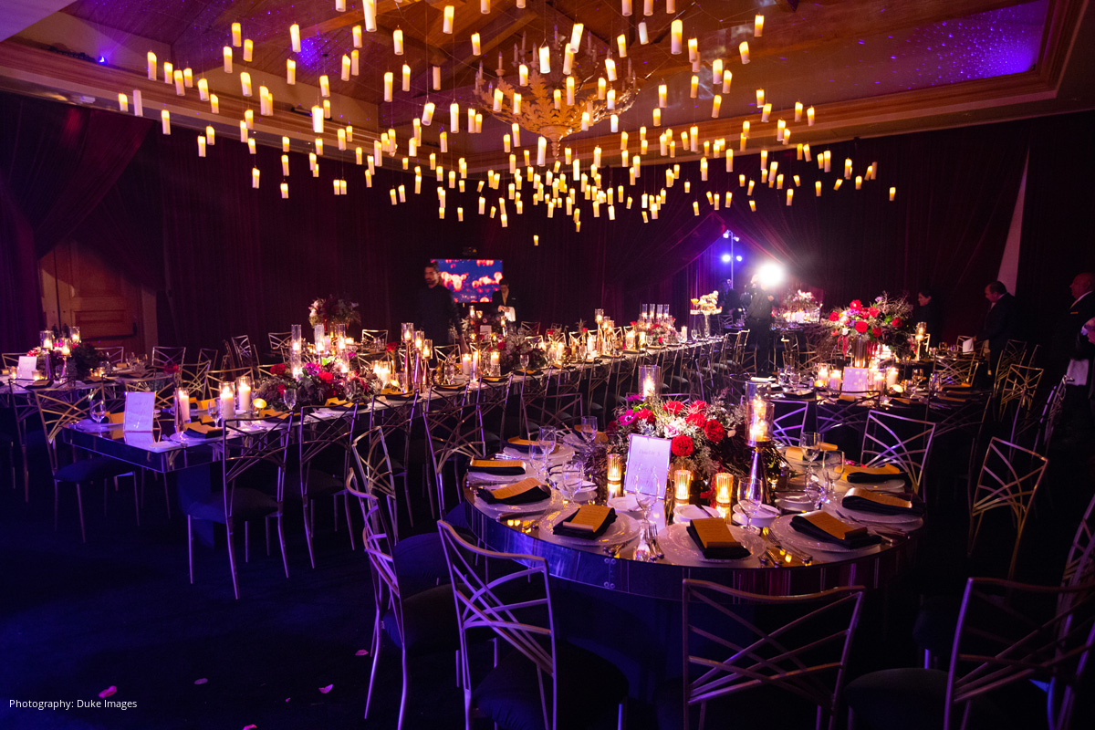Not wanting to have a lengthy engagement, the newly engaged couple set their wedding date for that Fall. “We were inspired by Harry Potter and Maleficent and wanted our wedding to be a night of mystique and fantasy,” describes Krystal. “The reception ambiance was moody and dark with a velvet merlot colored draping lining the entire room.