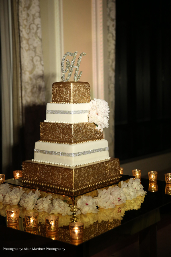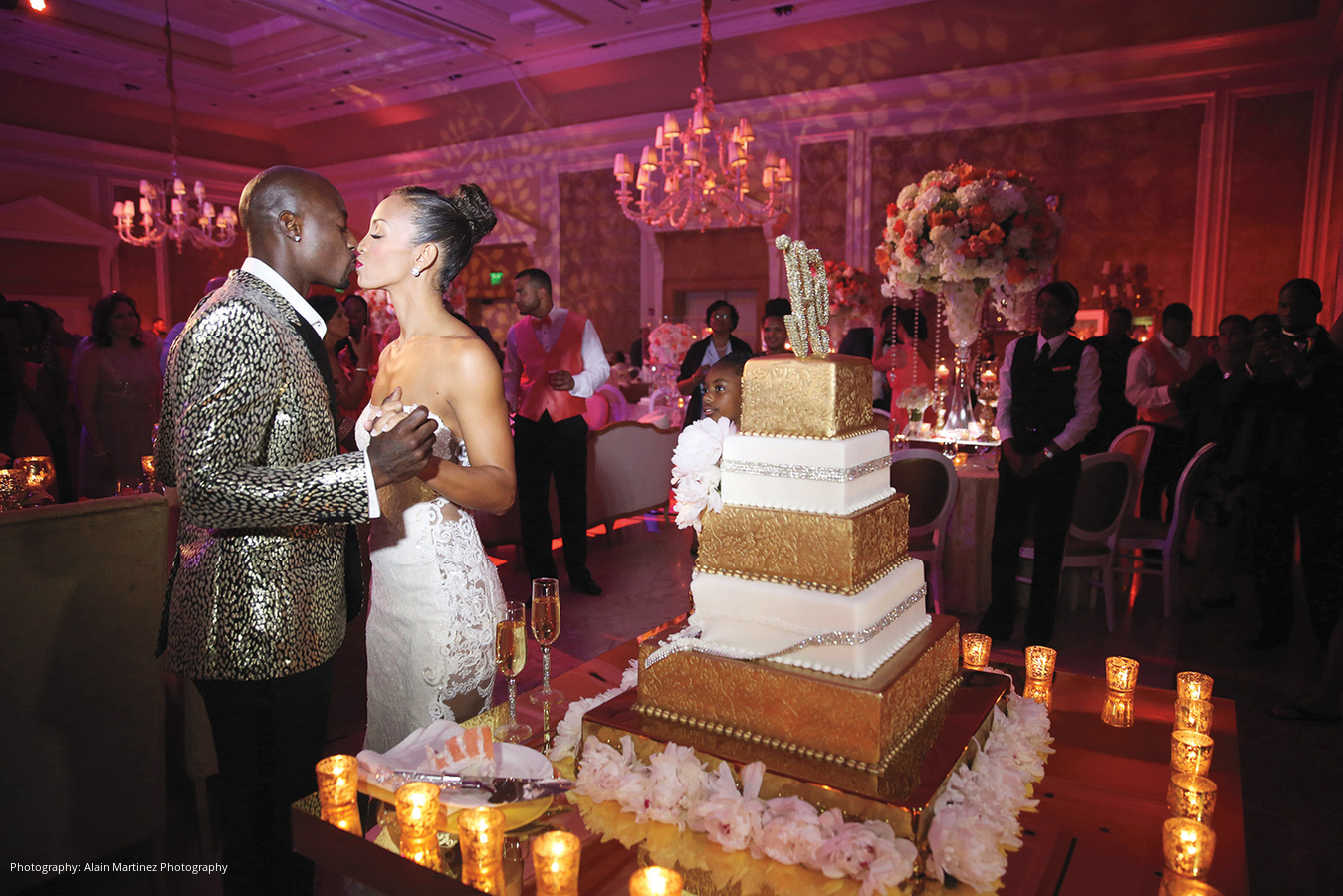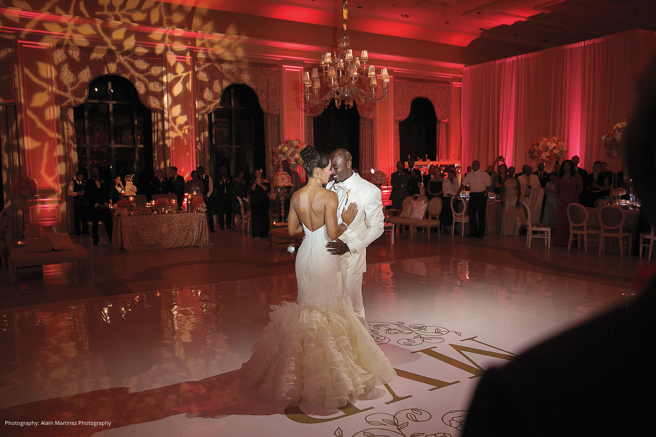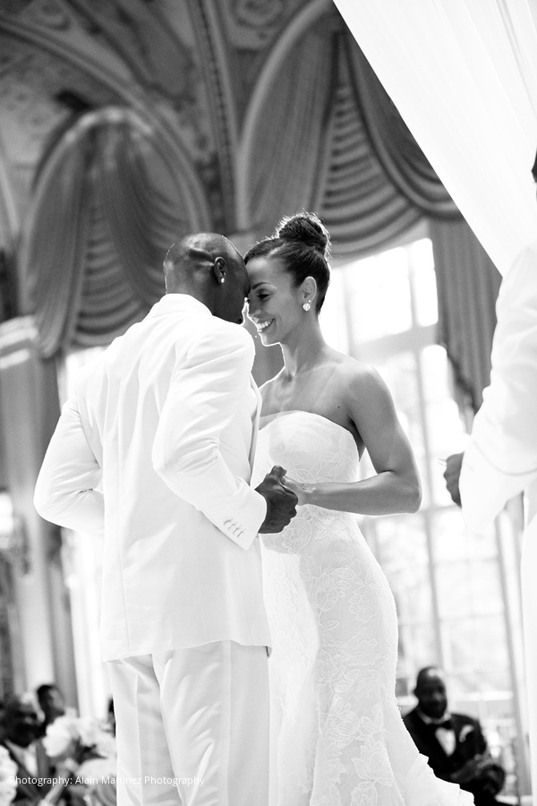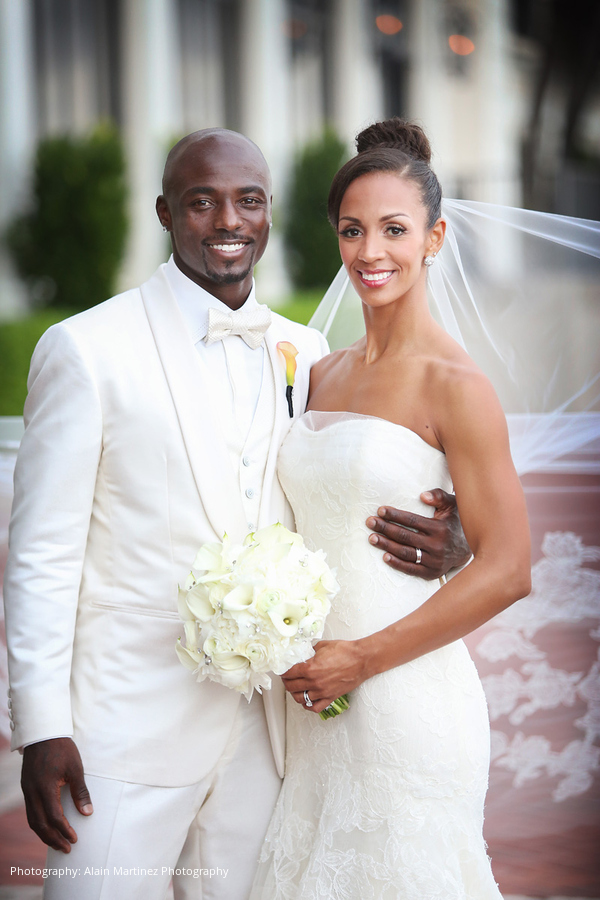 Following the ceremony and cocktail hour, the newlyweds made their choreographed entrance to Charlie Wilson’s “Life of the Party,” mixed by the DJ into “Here and Now” by Luther Vandross for the couple’s first dance. Dinner hadn’t yet been served but the DJ got everyone on the dance floor. Mango sorbet in MVP ice sculptures served as a palate cleanser prior to the meal of filet, sea bass and other delights. After a change of attire, the duo cut their five-tier coral velvet and white chocolate mousse cake.