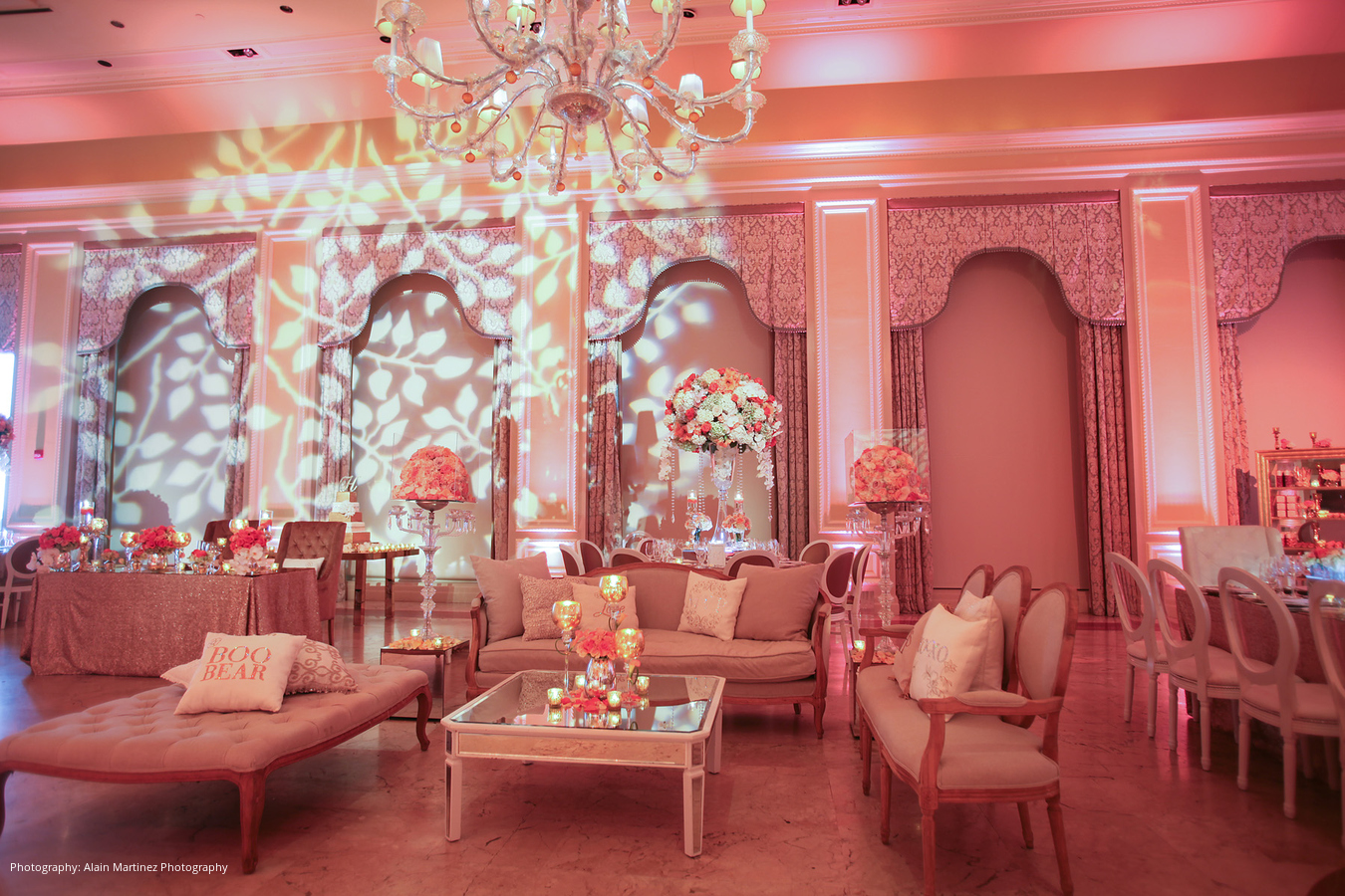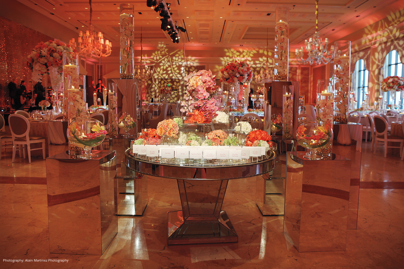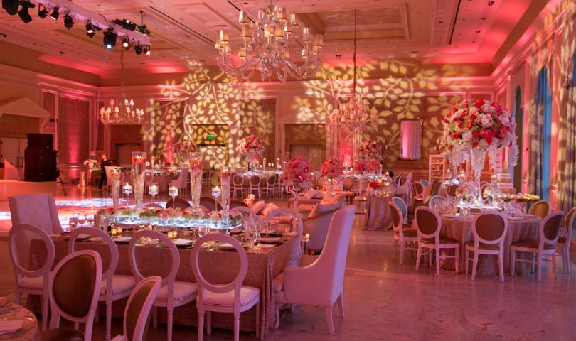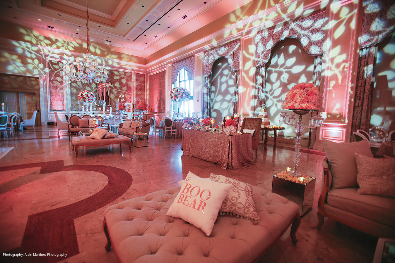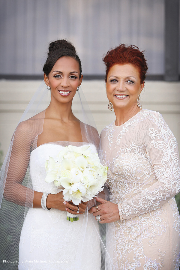 Following the ceremony and cocktail hour, the newlyweds made their choreographed entrance to Charlie Wilson’s “Life of the Party,” mixed by the DJ into “Here and Now” by Luther Vandross for the couple’s first dance. Dinner hadn’t yet been served but the DJ got everyone on the dance floor. Mango sorbet in MVP ice sculptures served as a palate cleanser prior to the meal of filet, sea bass and other delights. After a change of attire, the duo cut their five-tier coral velvet and white chocolate mousse cake.