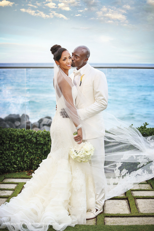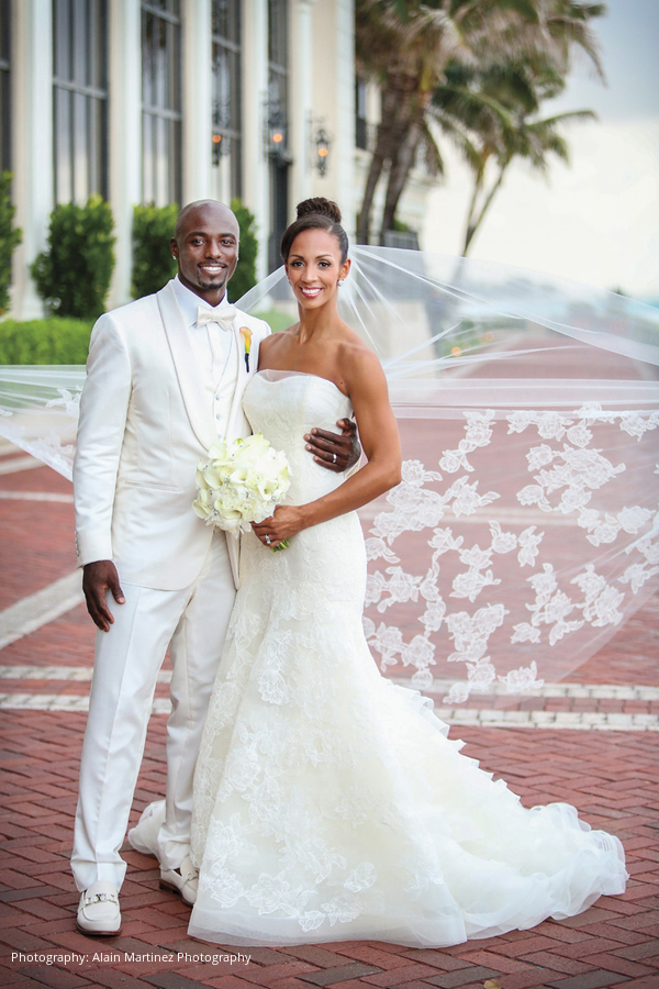 The three-day weekend took place at The Breakers Palm Beach. On Thursday, all 150 guests were treated to a Palm Beach chic welcome dinner. The Friday evening “Royal MVP ceremony” was a “five-star kind of wedding,” explains Lauren. The Breakers’ Mediterranean Ballroom was filled with more than half a million flowers in hues of coral, gold, champagne and cream. As the groom walked down the aisle, an orchestra played Phil Collins’ “In the Air Tonight.” Prior to Lauren making her entrance, golden gates were erected to mimic the couple’s invitation. As the gates opened and she began her walk down the aisle—a runner of plush, white carpeting—a gospel choir beganto sing Whitney Houston’s “Joy.” “I looked nowhere else but at Santonio,” says Lauren. “I was filled with so much happiness. It was like a dream.” “I tried to hold back the tears, but it didn’t work,” adds Santonio.