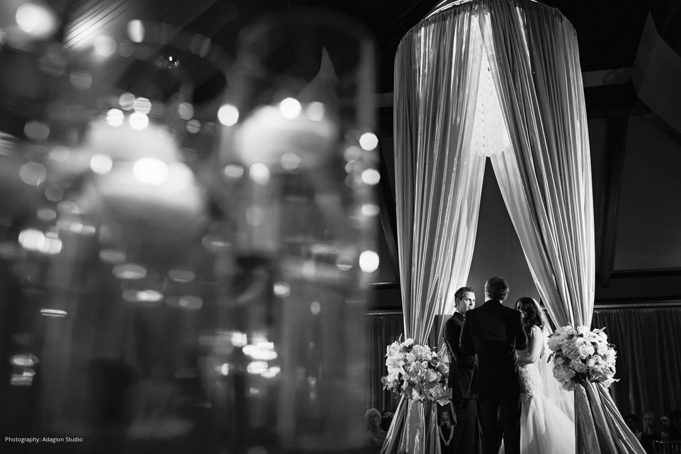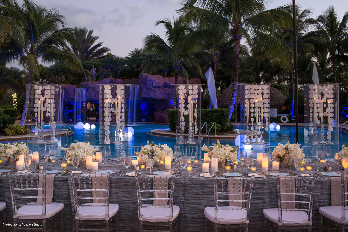 Hosted by The Players Club, the big day took place without a single glitch, and a talented group of vendors made it possible for the bride and groom to relax and enjoy the entire experience. A romantic and modern setting was created for them with wedding décor that included stunning floral designs by Fifty50, along with fantastic lighting by Bay Stage Live. Vanderbilt Strings provided live ceremony entertainment, the band Powerhouse kept guests dancing until 3am, surprise dancers added another element of excitement, and a fireworks display kept everyone talking about the festivities for months.