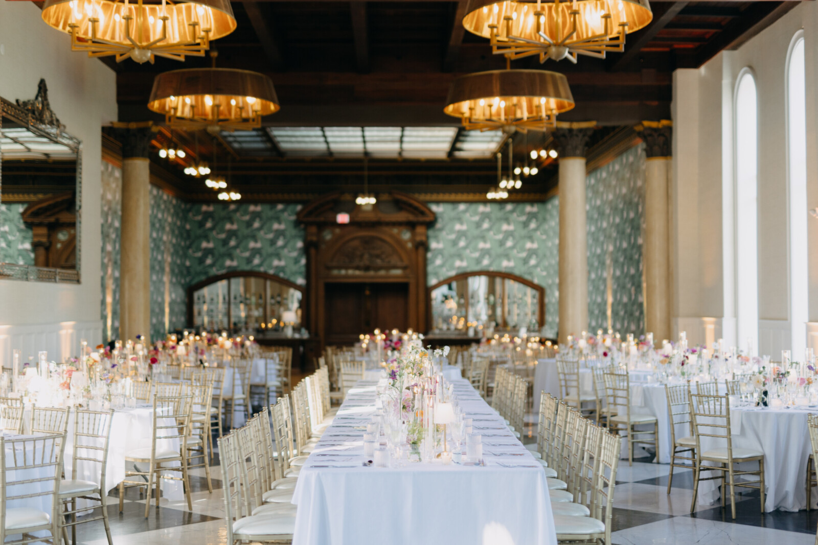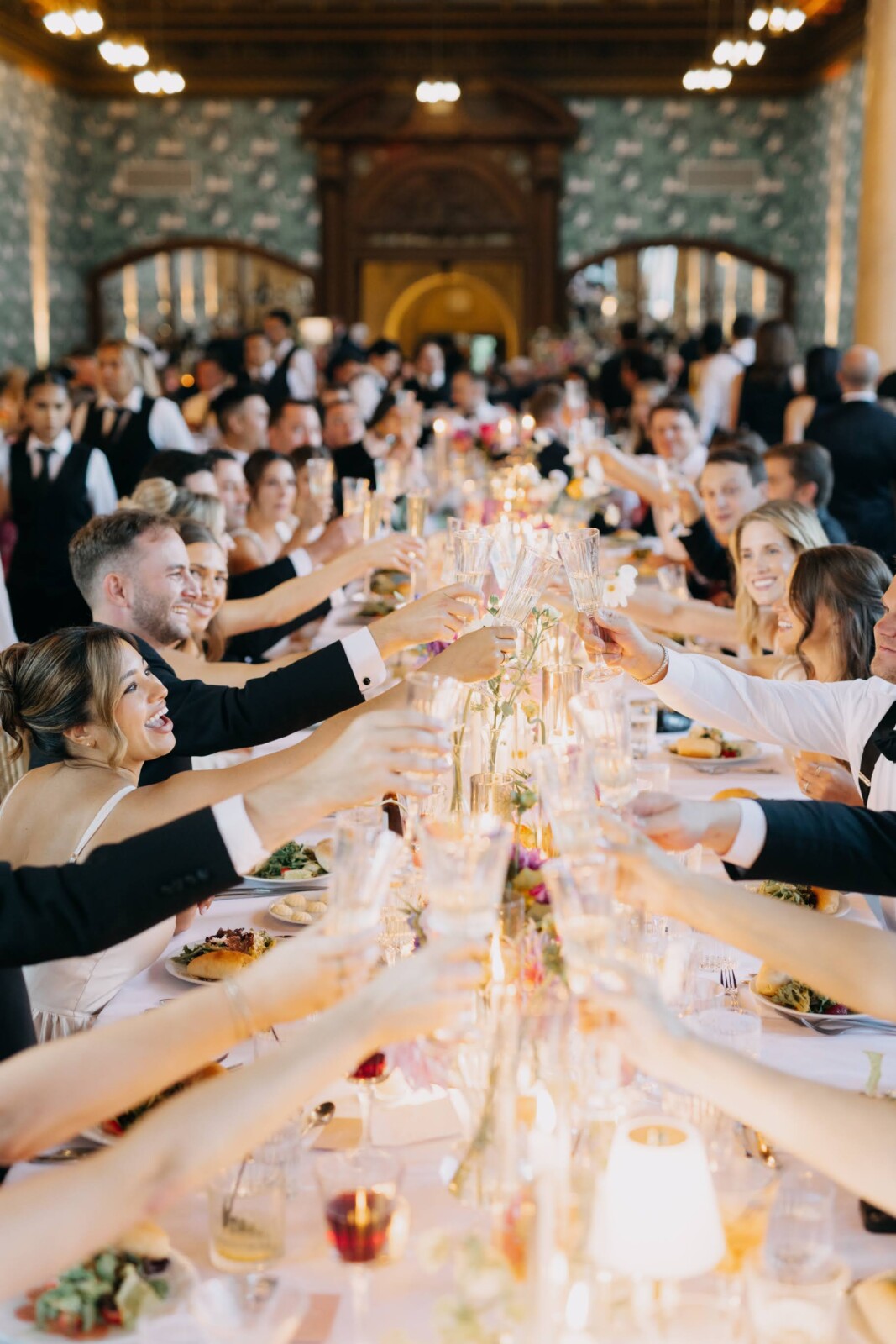“Margaux St. Ledger, our florist, is AN ARTIST,” Kelly emphasizes. “She was fun to work with and brought this crazy vision we had for a huge floral centerpiece/seating chart to life so flawlessly. It was a standout element of the day, waiting for all the guests as they made their way inside the Great Hall. The library was one of our favorite rooms. We were able to decorate the bookshelves with photos of loved ones who had passed, plus some quotes from our favorite music and poems (music was something we bonded over from the very start). In the reception space, we were thrilled to be surrounded by our wedding party at a King's Table—decorated with whimsical, colorful florals, lamps, and candles. It was an absolute dream.”