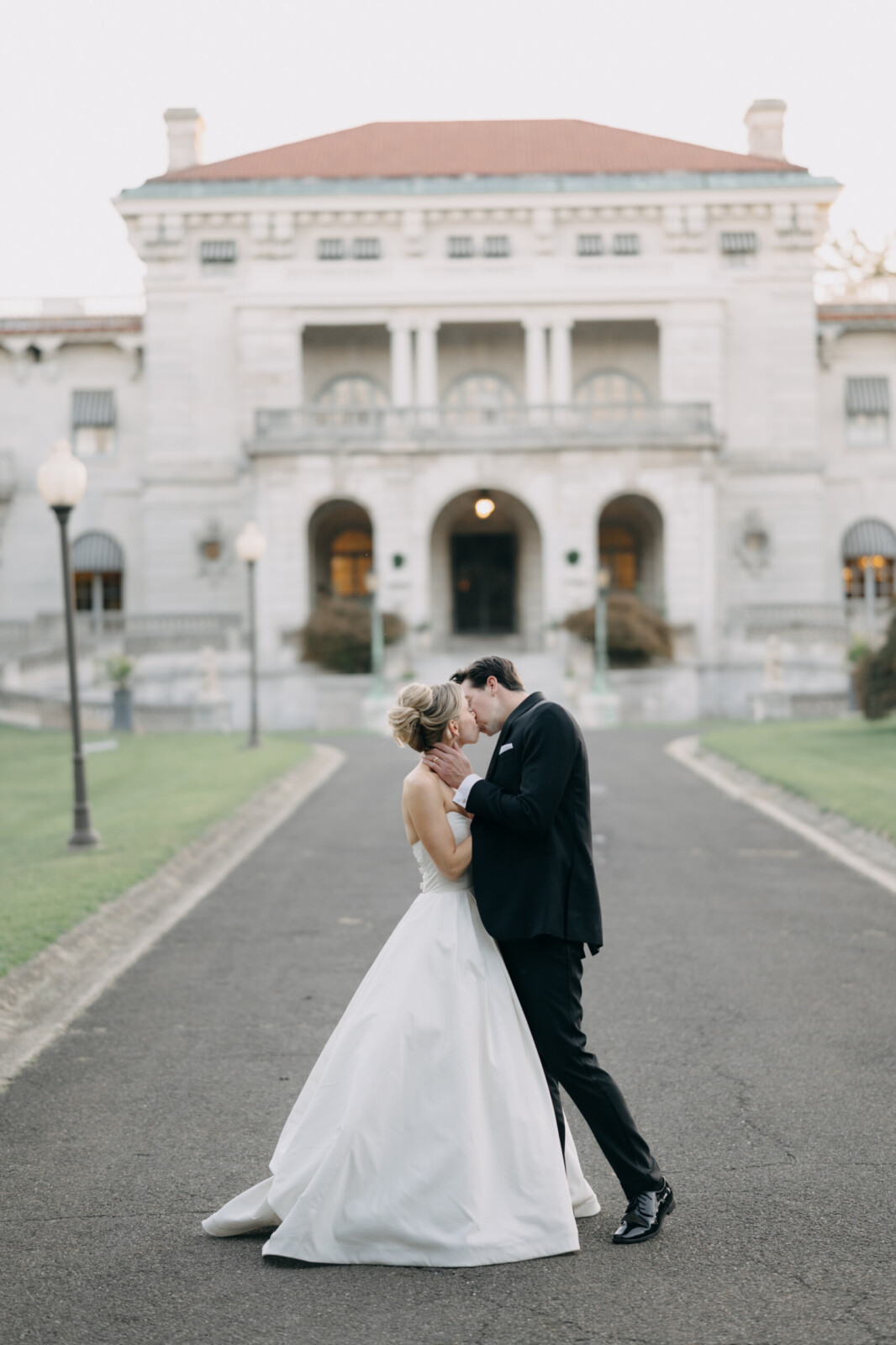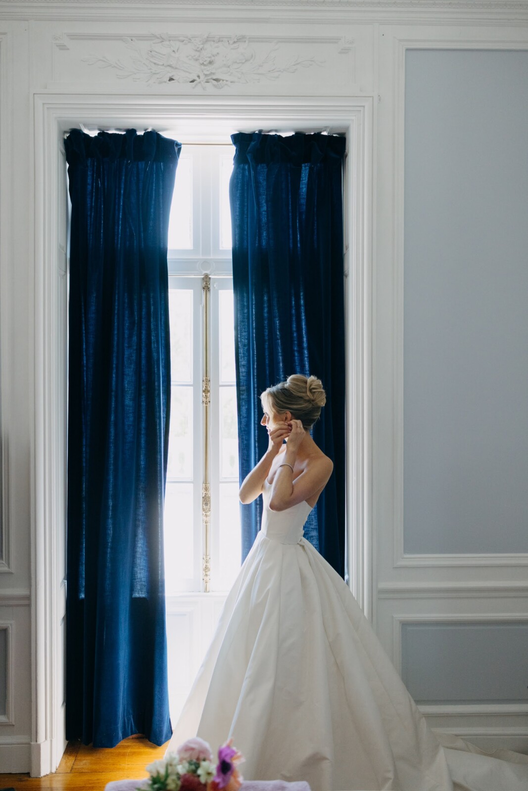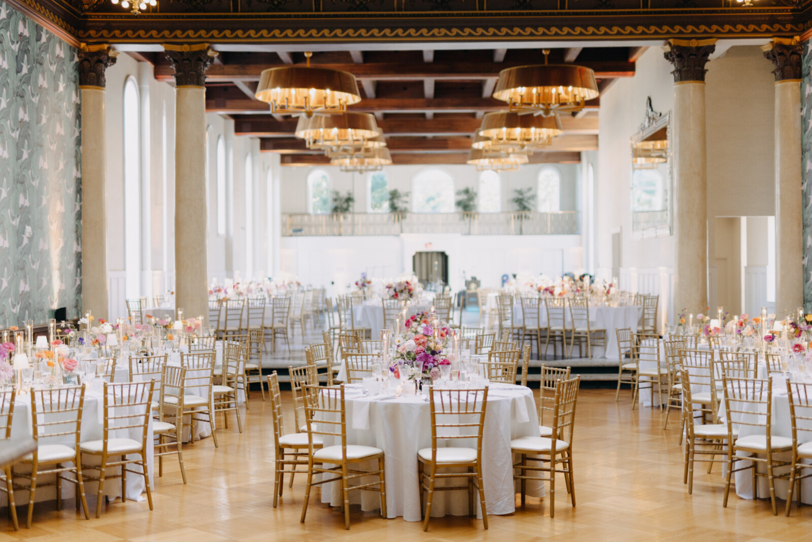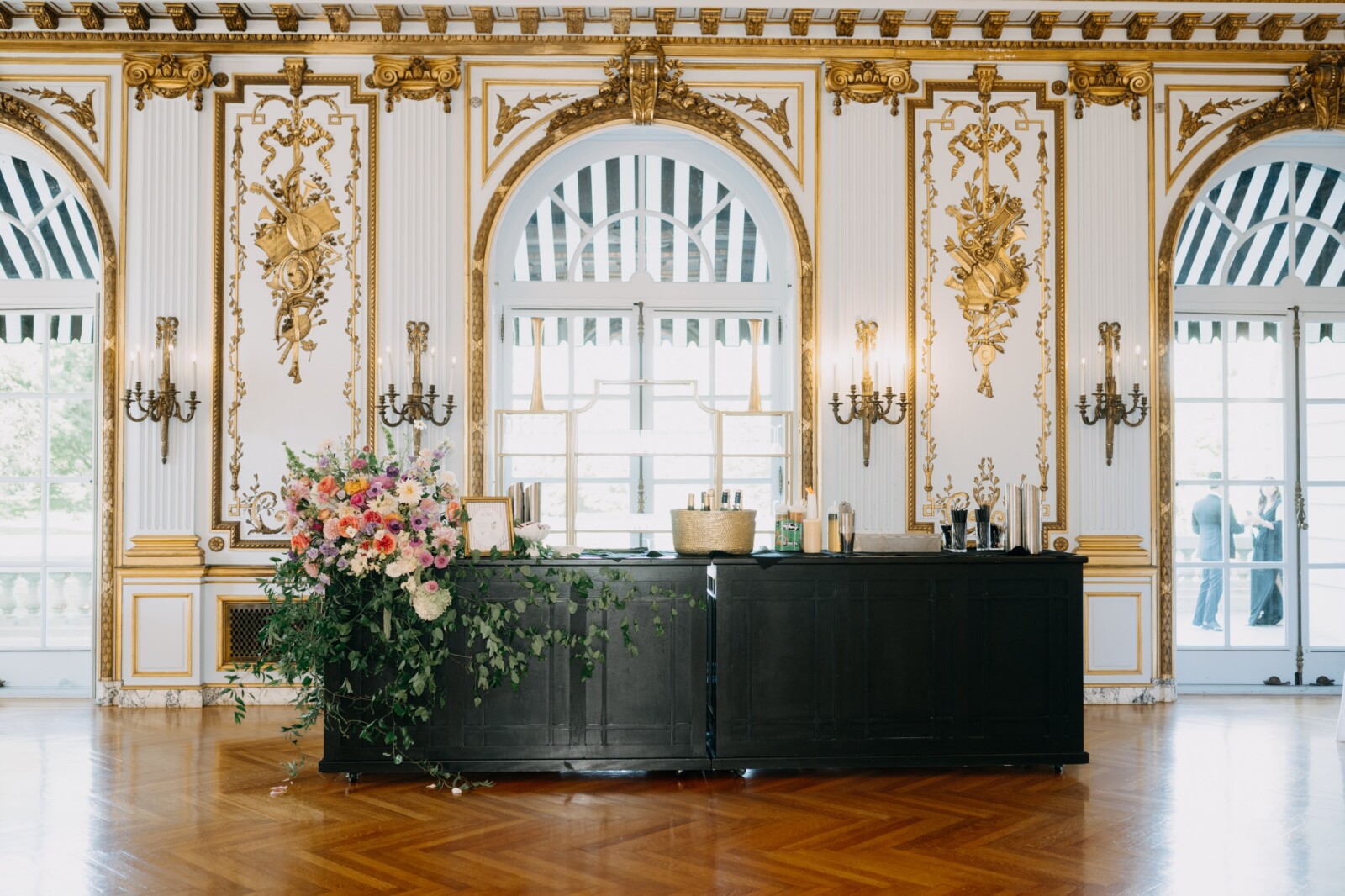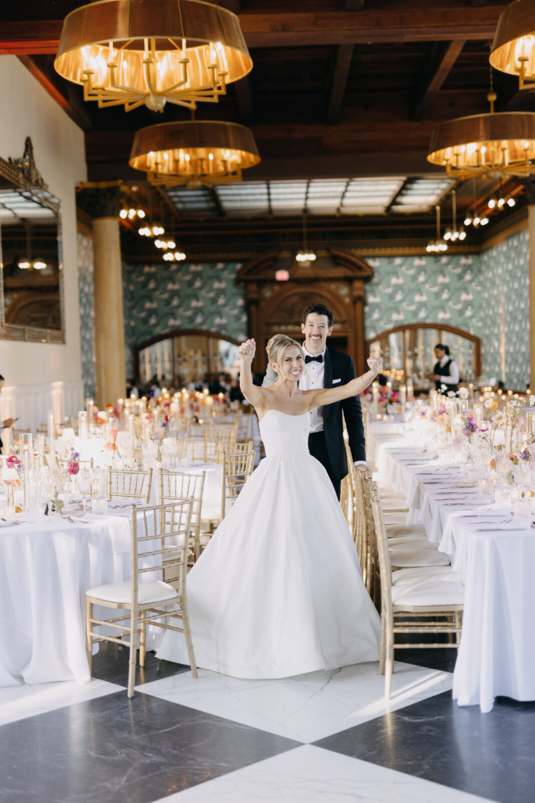 The couple had their hearts set on a modern chateau vibe, allowing the Gilded Age grandeur of their wedding venue, Elkins Estate, shine through. They also incorporated pops of whimsy and color throughout the floral designs and décor details.