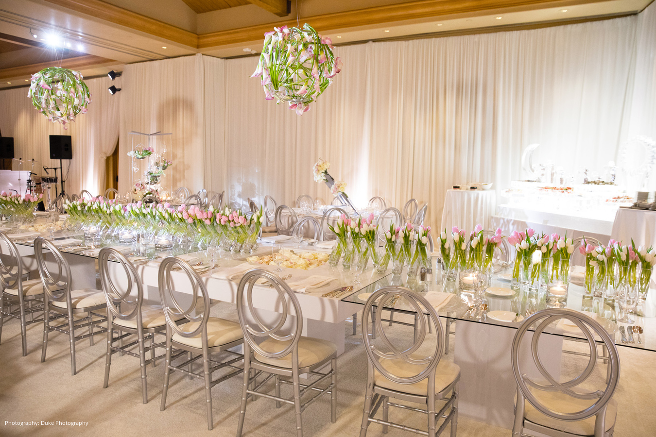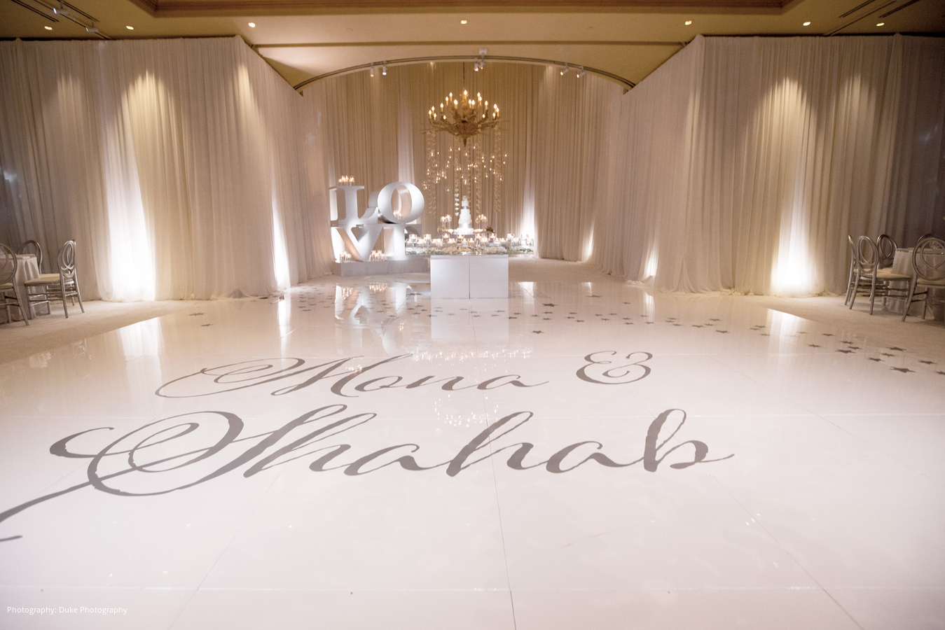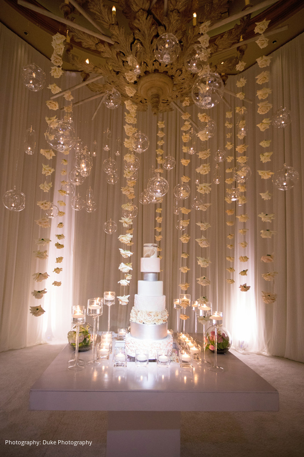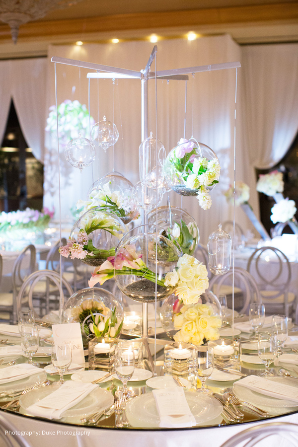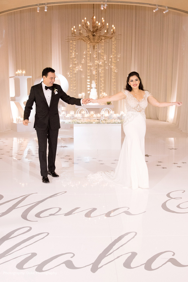 Ever since they started dating, Shahab would call Mona his “Moon.” With his name meaning “shooting star” in Farsi, the bride and groom decided to use a theme of the sun, moon and stars for their wedding décor. A modern ambiance was created with white carpeting, white drapes, and a custom white and silver dance floor. The flowers were designed by Square Root Events, and each table had its own unique style, keeping with the sun, moon and stars theme.