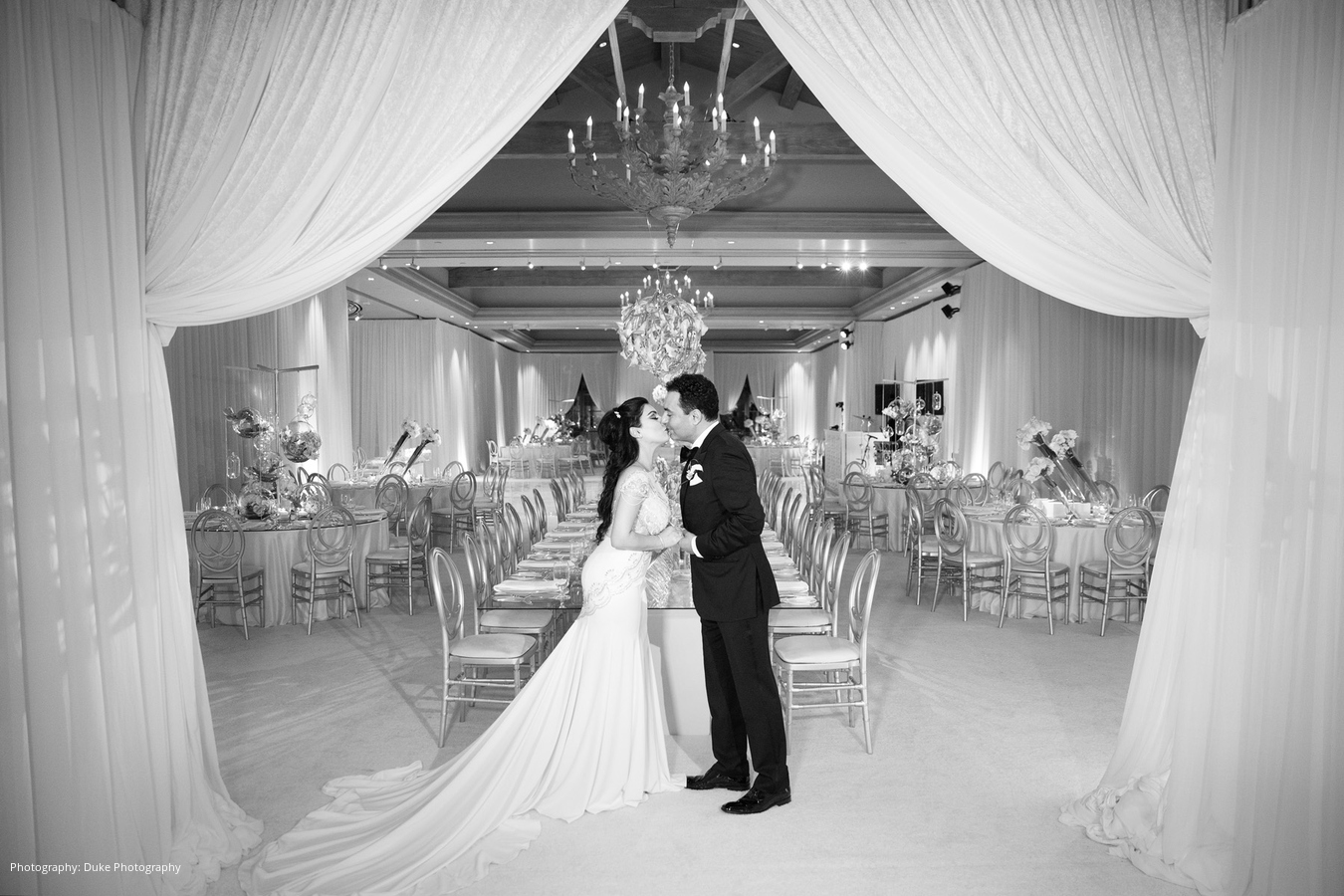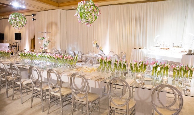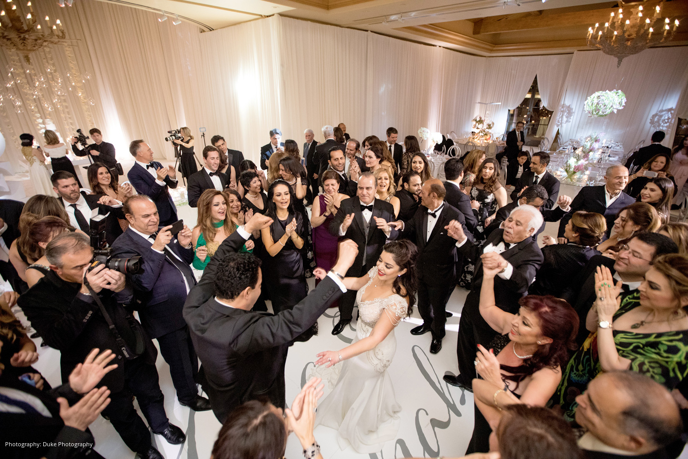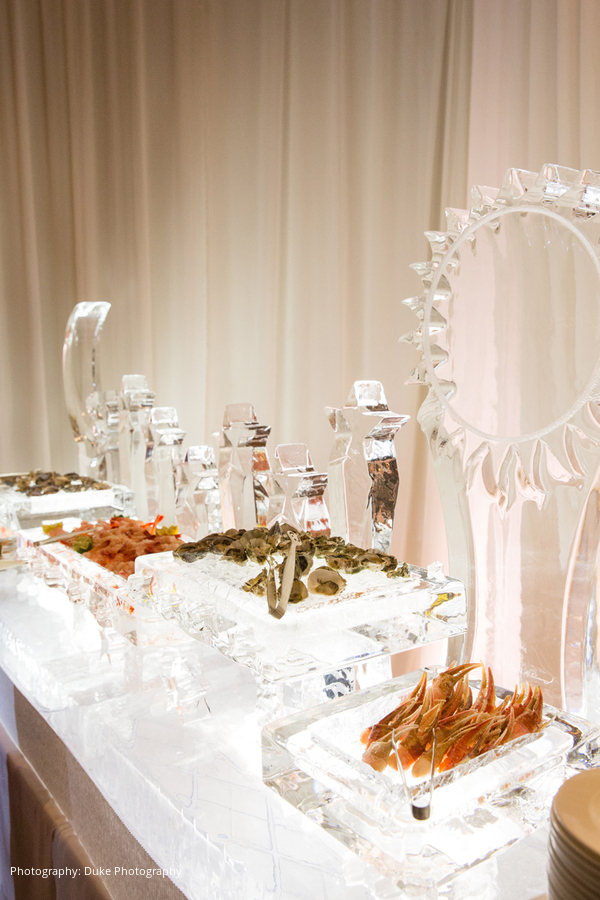 Ever since they started dating, Shahab would call Mona his “Moon.” With his name meaning “shooting star” in Farsi, the bride and groom decided to use a theme of the sun, moon and stars for their wedding décor. A modern ambiance was created with white carpeting, white drapes, and a custom white and silver dance floor. The flowers were designed by Square Root Events, and each table had its own unique style, keeping with the sun, moon and stars theme.