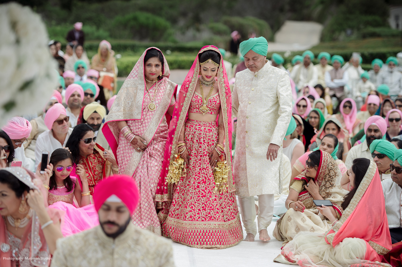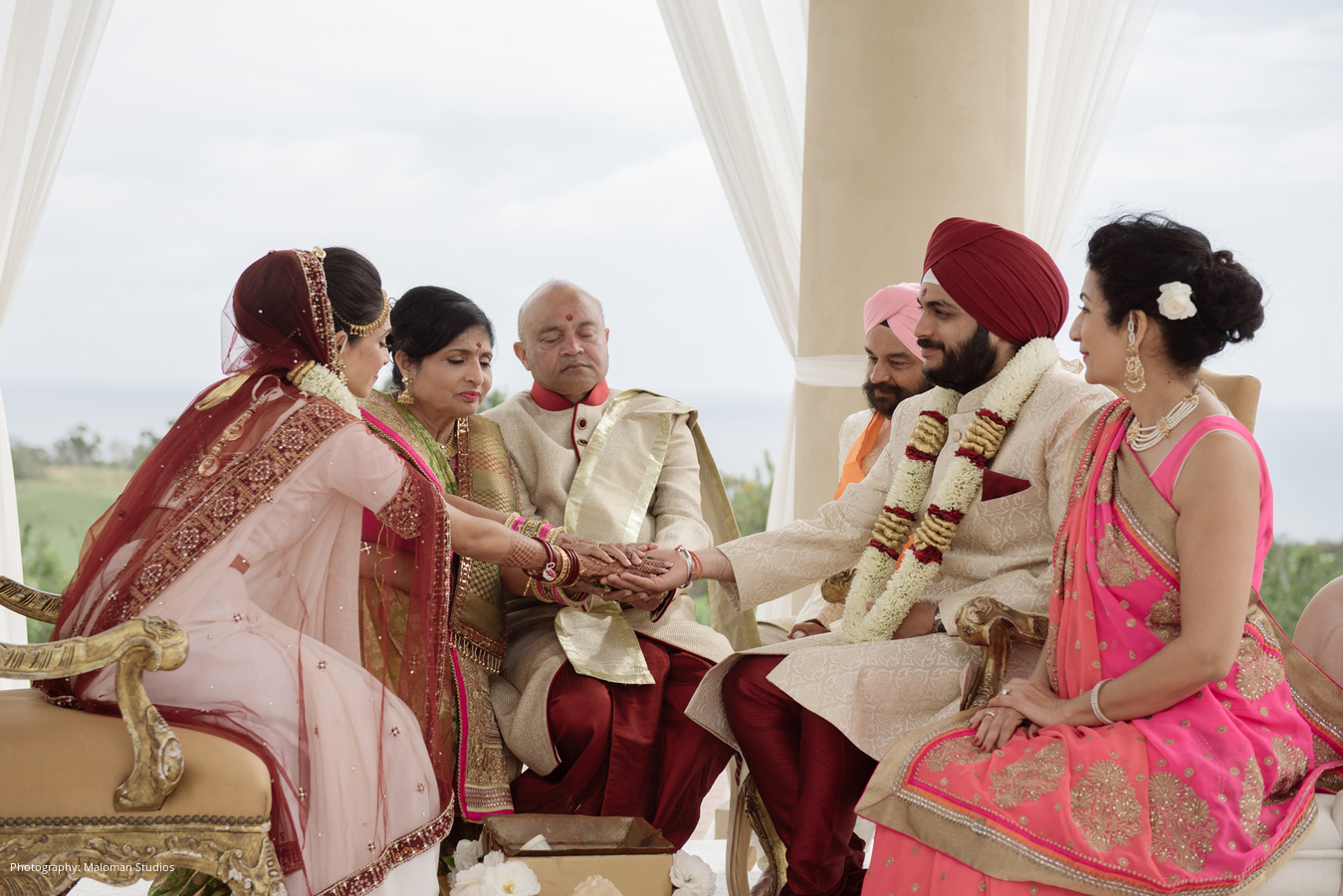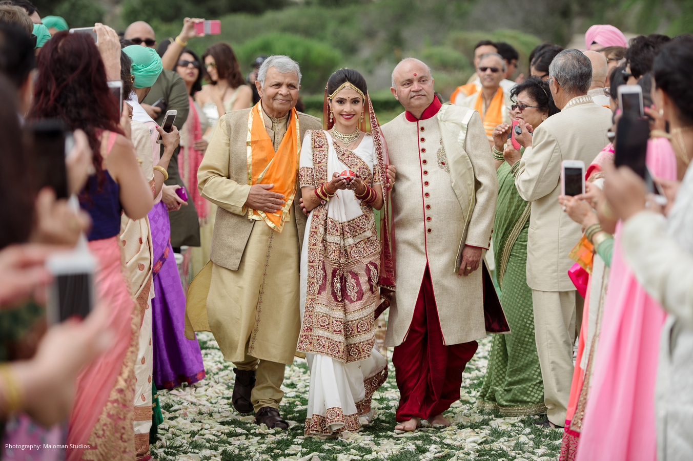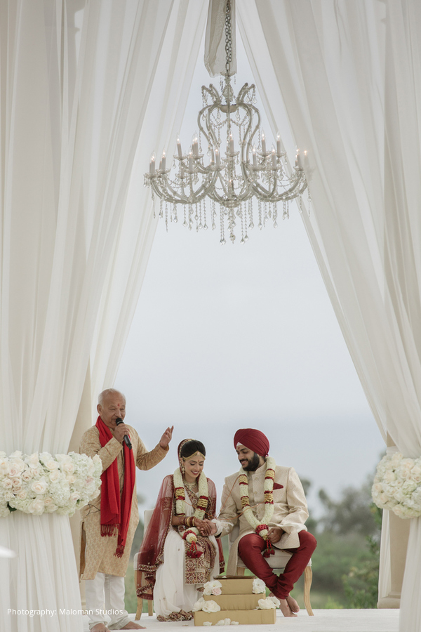 Location: The Resort at Pelican Hill Newport Coast, CA; Planner: Elegant Events, Fullerton, CA; Floral and Event Design: Bloom Box, Costa Mesa, CA; Dresses: Sabyasachi