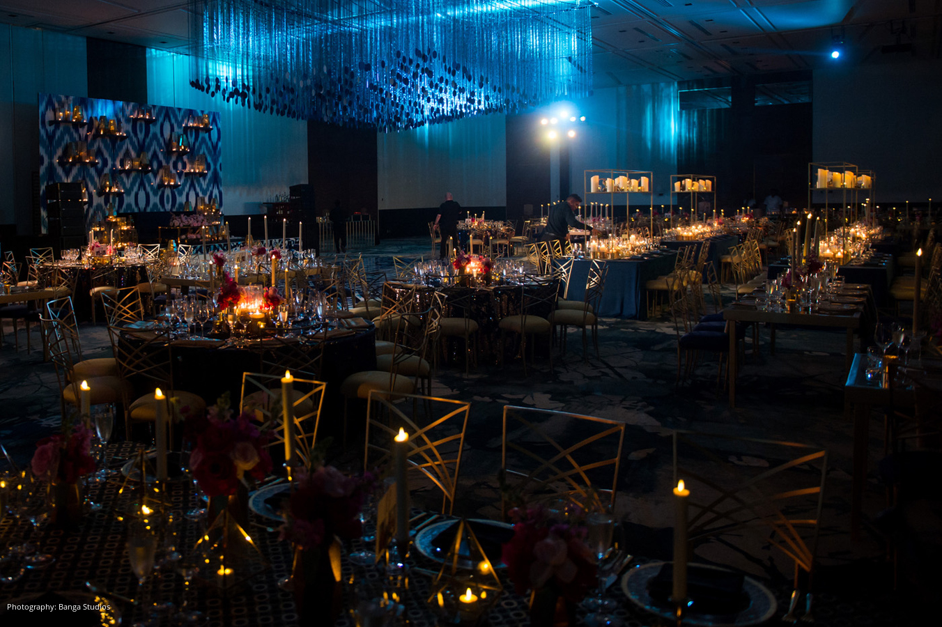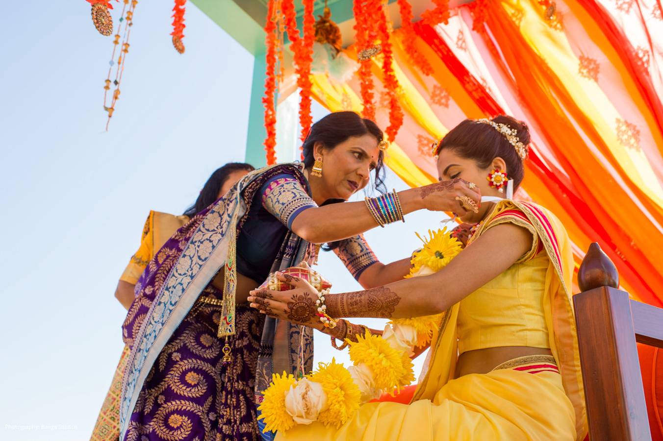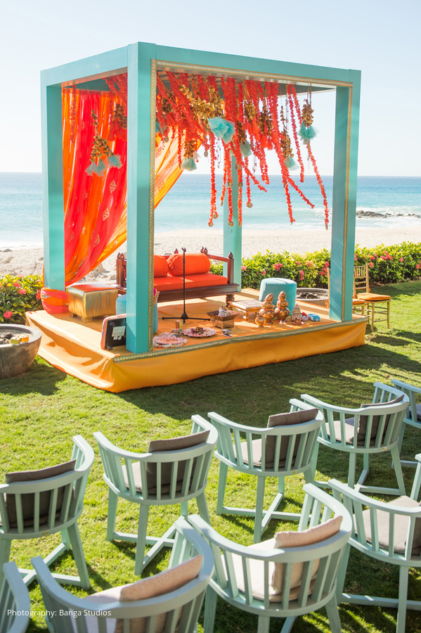 Every night we were transported to far-off scenes, courtesy of our decor team. At first, it was as if we were amidst the colors and electricity of a carnival for our welcome night. The next day, were in the serenity of a peaceful garden at our the pithi/satak. The next morning, it was a rustic, cozy wedding with waves crashing against the rocks behind us. It all culminated in our regal navy and gold wedding reception.”