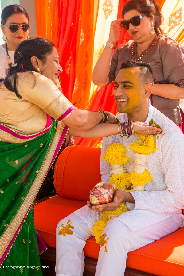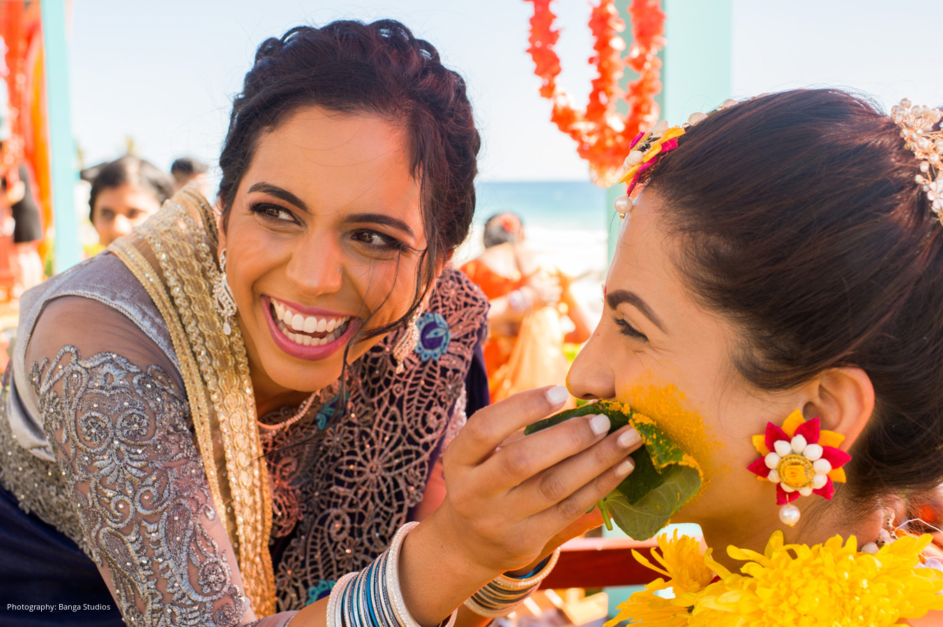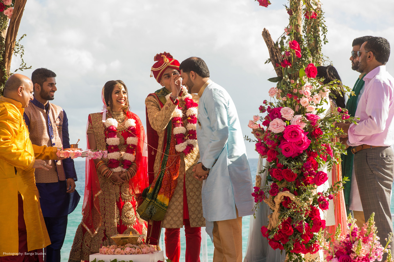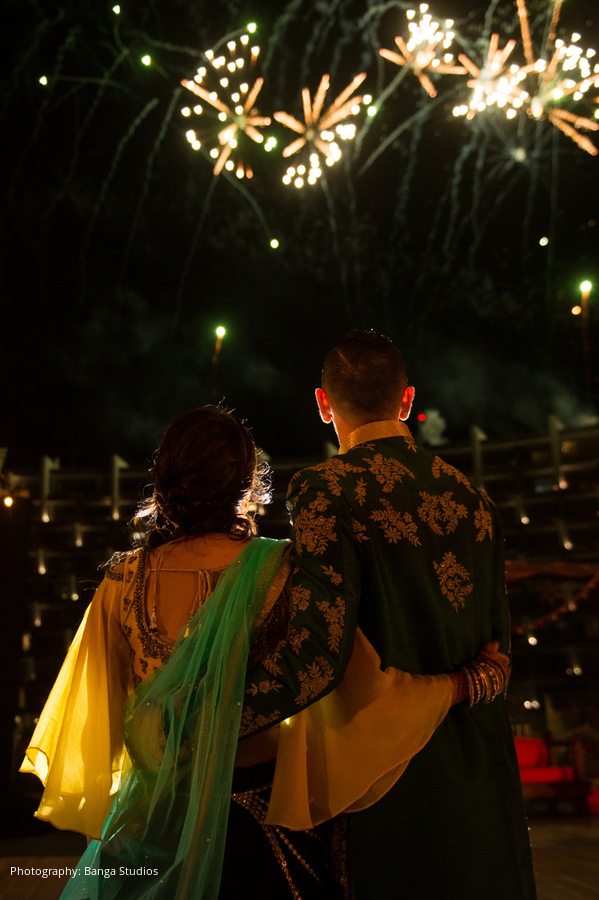 Every night we were transported to far-off scenes, courtesy of our decor team. At first, it was as if we were amidst the colors and electricity of a carnival for our welcome night. The next day, were in the serenity of a peaceful garden at our the pithi/satak. The next morning, it was a rustic, cozy wedding with waves crashing against the rocks behind us. It all culminated in our regal navy and gold wedding reception.”