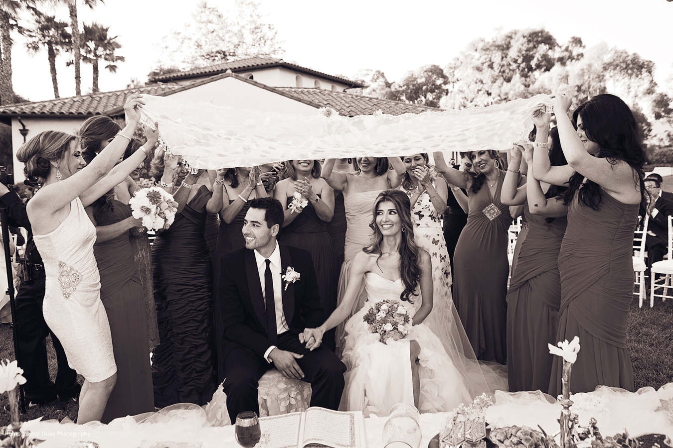 The couple’s Muslim ceremony included many traditional customs. One of Sara’s favorite memories is of a swarm of loving women approaching, holding a cloth over her and Cyrus’ heads and grinding sugar cubes into it that sifted through, frosting the couple and assuring sweetness in their marriage.