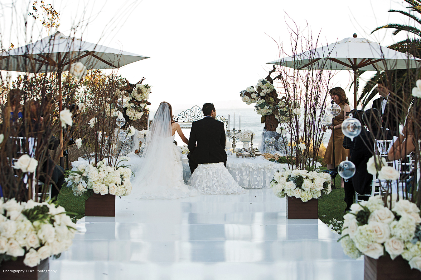 Location and Caterer: The Ritz-Carlton Bacara, Santa Barbara, Santa Barbara, CA; Cake: Joanie and Leigh’s Cakes, Beverly Hills, CA; Event Planner: Events by Shideh, Los Angeles, CA; Floral Design: Shirvan Design, Los Angeles, CA; Linen and Rentals: Royal Events, Inc., San Fernando, CA; Lighting: Sky Lighting, Lake Balboa, CA; Stationery: Especially For You Designs, Tarzana, CA; Wedding Dress: Monique Lhuillier
