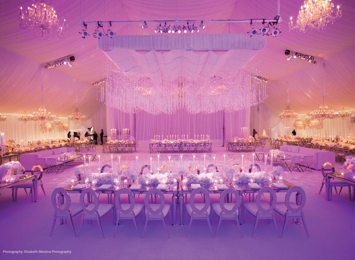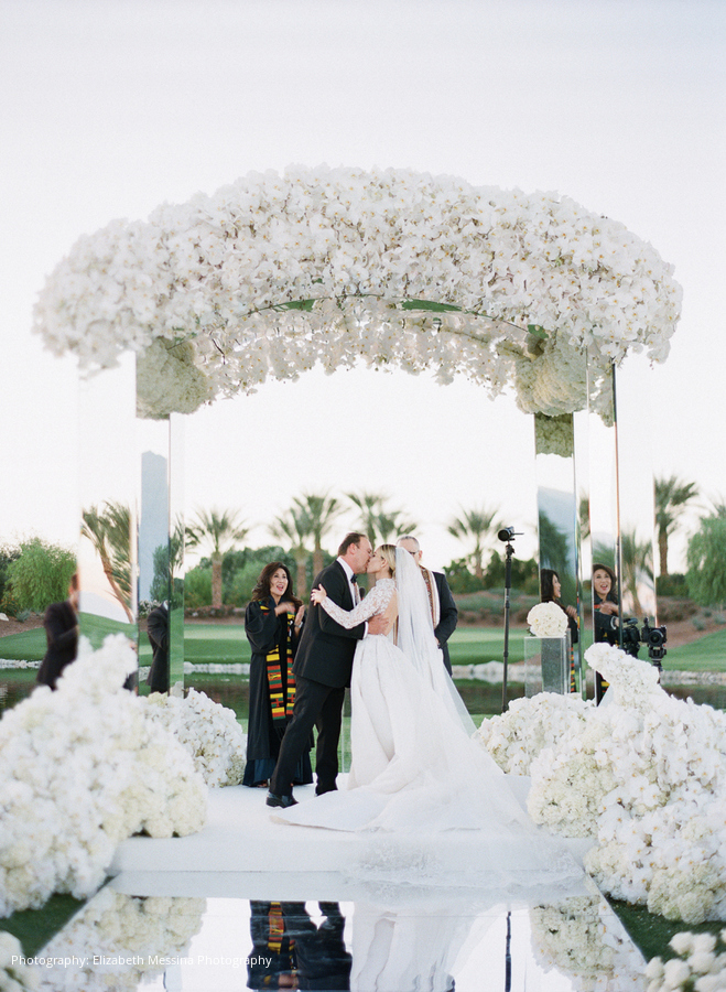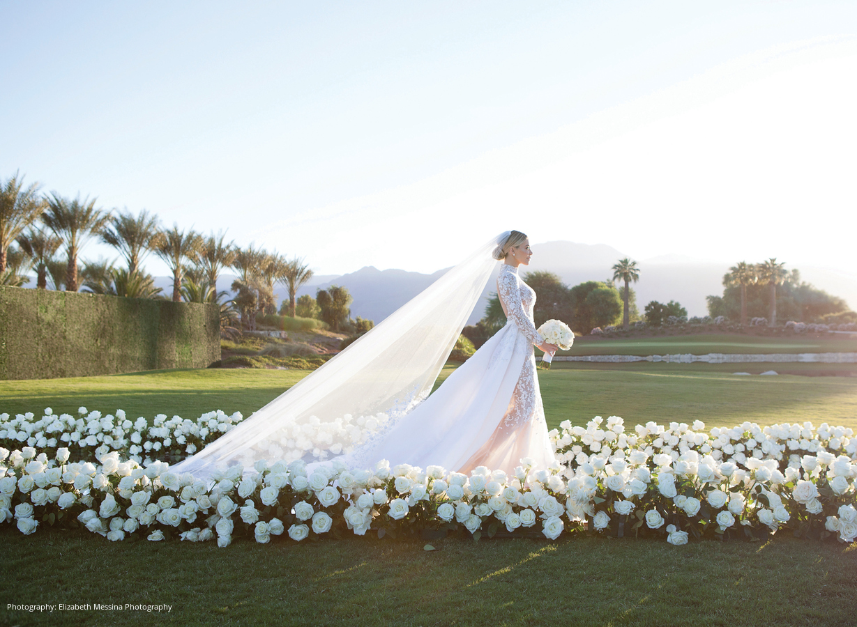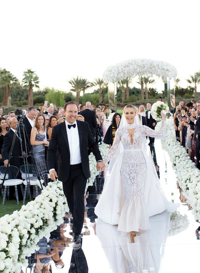 The wedding weekend was held in the peaceful desert setting of a private California estate, where 210 guests gathered from around the world. Prior to the big day, the couple hosted a Friday night white party which mimicked the décor and ambiance of L’Opéra in Saint-Tropez. The bride-to-be donned a pink illusion gown by Reem Acra, and the festivities carried on until 2:00 a.m.