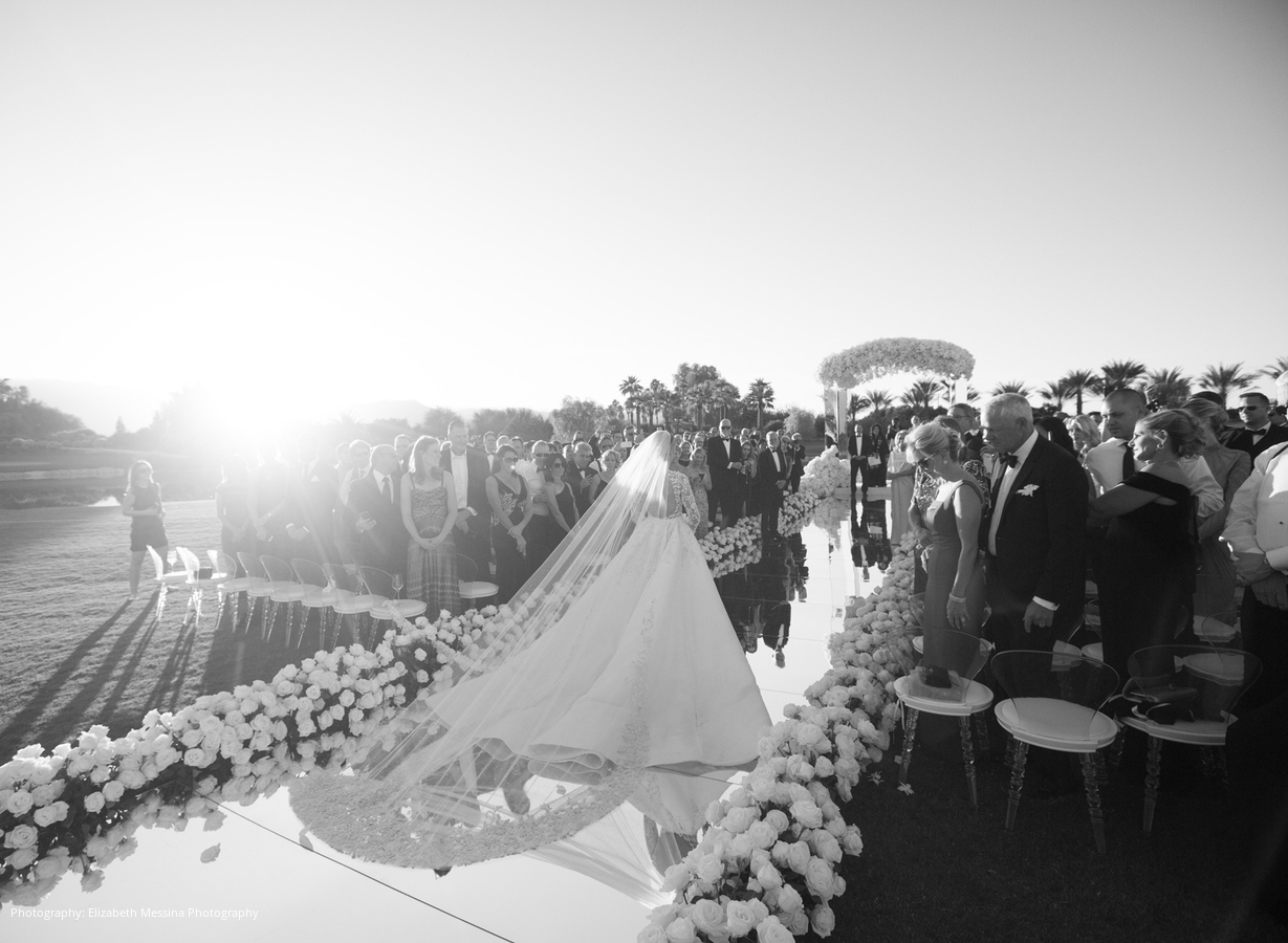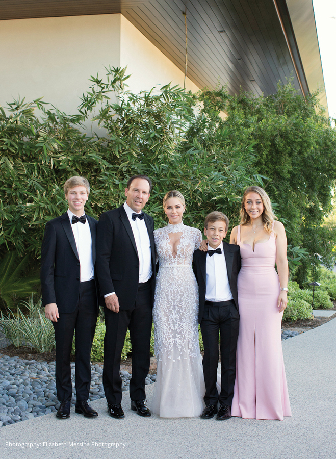 When everyone reconvened the following afternoon for a sunset ceremony, David’s three children walked down the aisle to the music of a full symphony, followed by the bride. “I loved the walk down the aisle and looking into David’s eyes,” Tara reflects. “The aisle was mirrored, so it felt like I was walking on water. It was the most magical day I could have ever dreamed of in my whole life.”