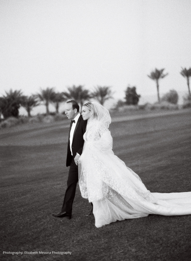Location: Private Estate, Coachella, CA; Planner: Sacks Productions, Calabasas, CA; Event Design: Revelry Event Designers, Los Angeles, CA; Floral Design: Jeff Leatham, Beverly Hills, CA; Rentals: Town & Country Event Rentals, Van Nuys, CA; Lighting: Images by Lighting, Los Angeles, CA; Stationery: Lehr & Black, Los Angeles, CA; Entertainment: Asher Devin Lucien, John Legend, Ludacris; Wedding Dress: Ralph & Russo; Reception Dress: Reem Acra; Bride’s Shoes: Gianvito Rossi; Groom’s Attire: Saint Laurent; Stylist: Charlene Roxborough; Hair: Jesus Guerrero; Makeup: Arianna Garcia and Etienne Ortega; Engagement Ring: Stephen Silver; Wedding Bands: Lorraine Schwartz