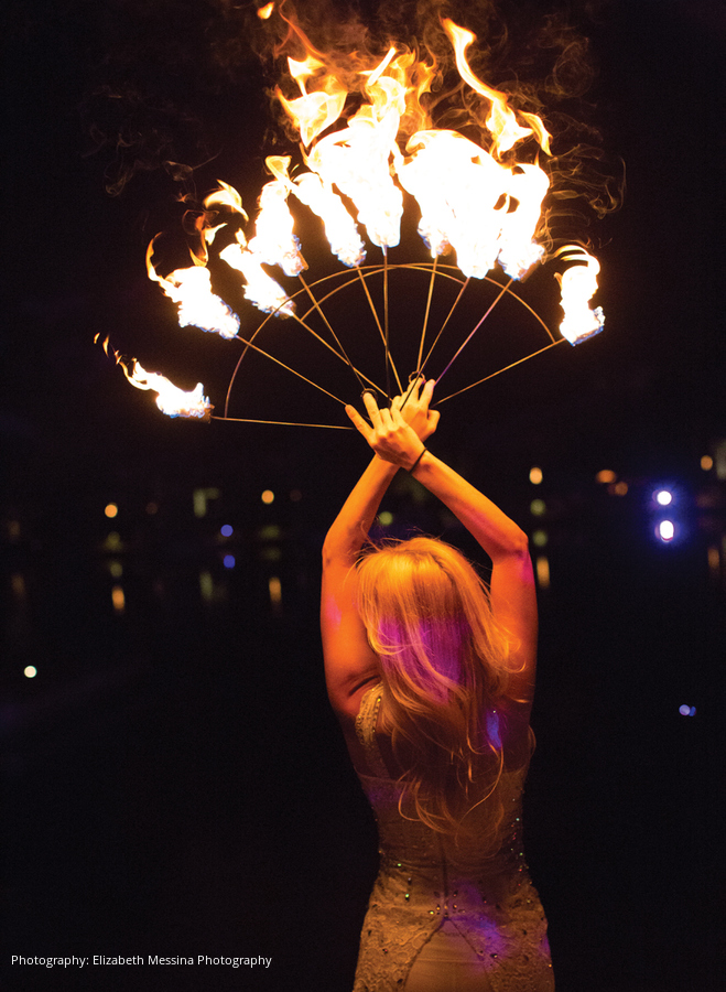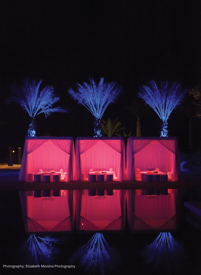 The afterparty was an energetic poolside spectacle of fire dancers, performers dressed in LED lights, and aerialists. It was only a matter of time before David’s eleven-year-old son jumped into the pool, followed by the newlyweds. “This wedding started out as a black-tie affair, and by 3:00 a.m. turned into a Vegas pool party,” David laughs. “There were fifty people in the pool in their tuxes, and everyone got kicked out after 4:30 a.m.”