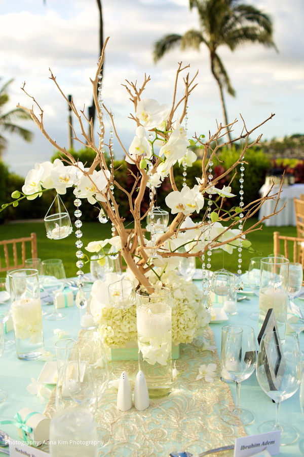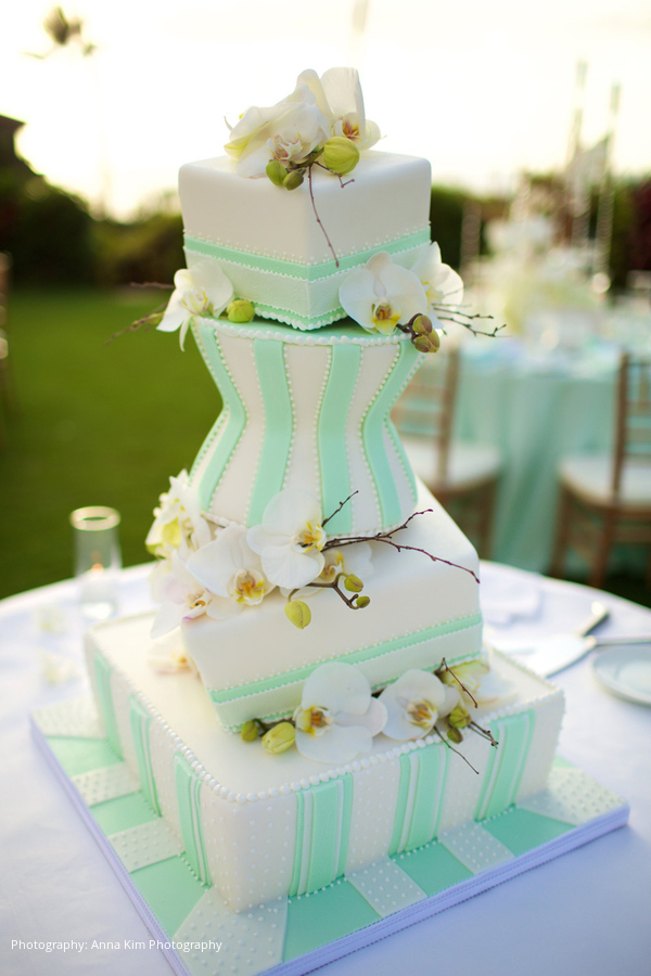 The wedding coordination team at the Four Seasons Resort took the couple’s initial ideas and were able to create a spectacular atmosphere, incorporating their chosen color palette and personality into the wedding décor. White flowers covered the grassy ceremony aisle and adorned every surface in sight. Tiffany blue accents were highlighted with dripping crystals, adding a timelessly elegant effect. “I loved the contrast of the asymmetrical cake as well,” says Tiya. “It added a little whimsical touch while keeping with the color scheme.”