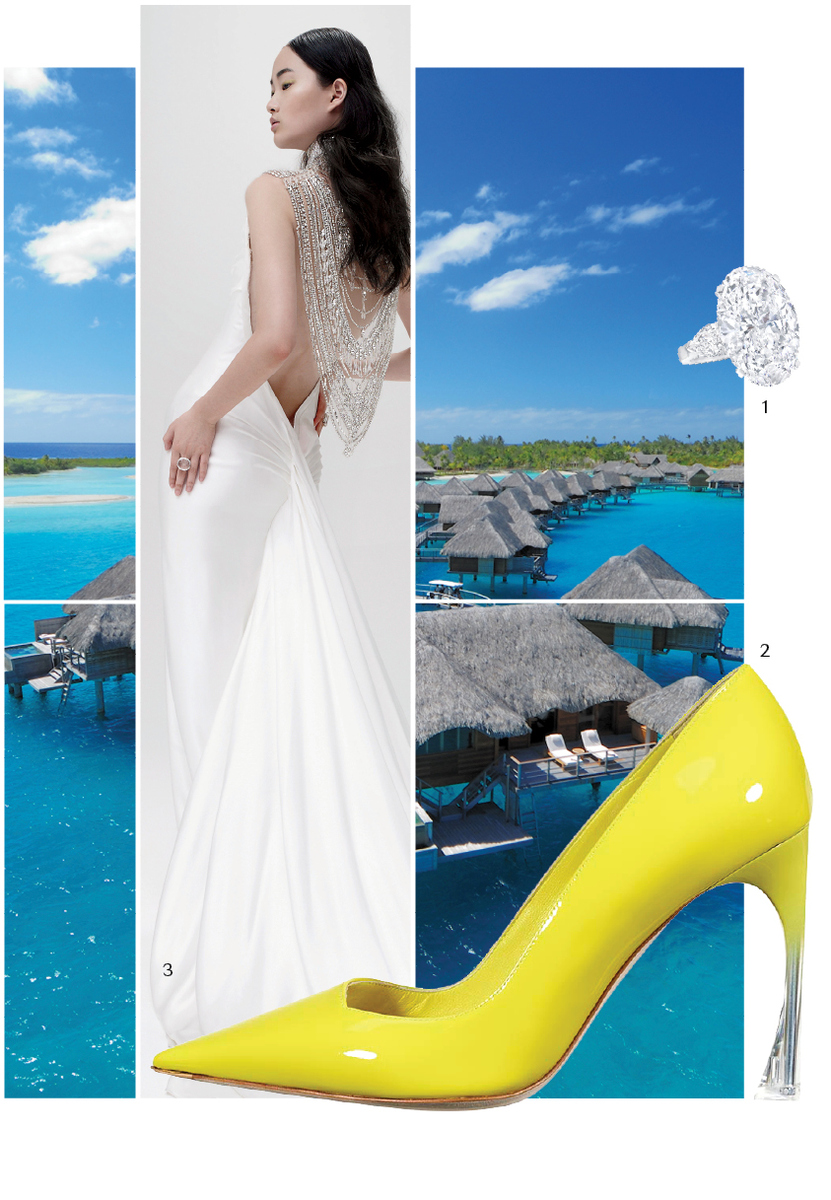 A romantic elopement at Four Seasons Resort Bora Bora with this sexy Ines Di Santo gown, a shoe that makes a statement by Dior and a diamond ring every women dreams to have by Graff Diamonds.